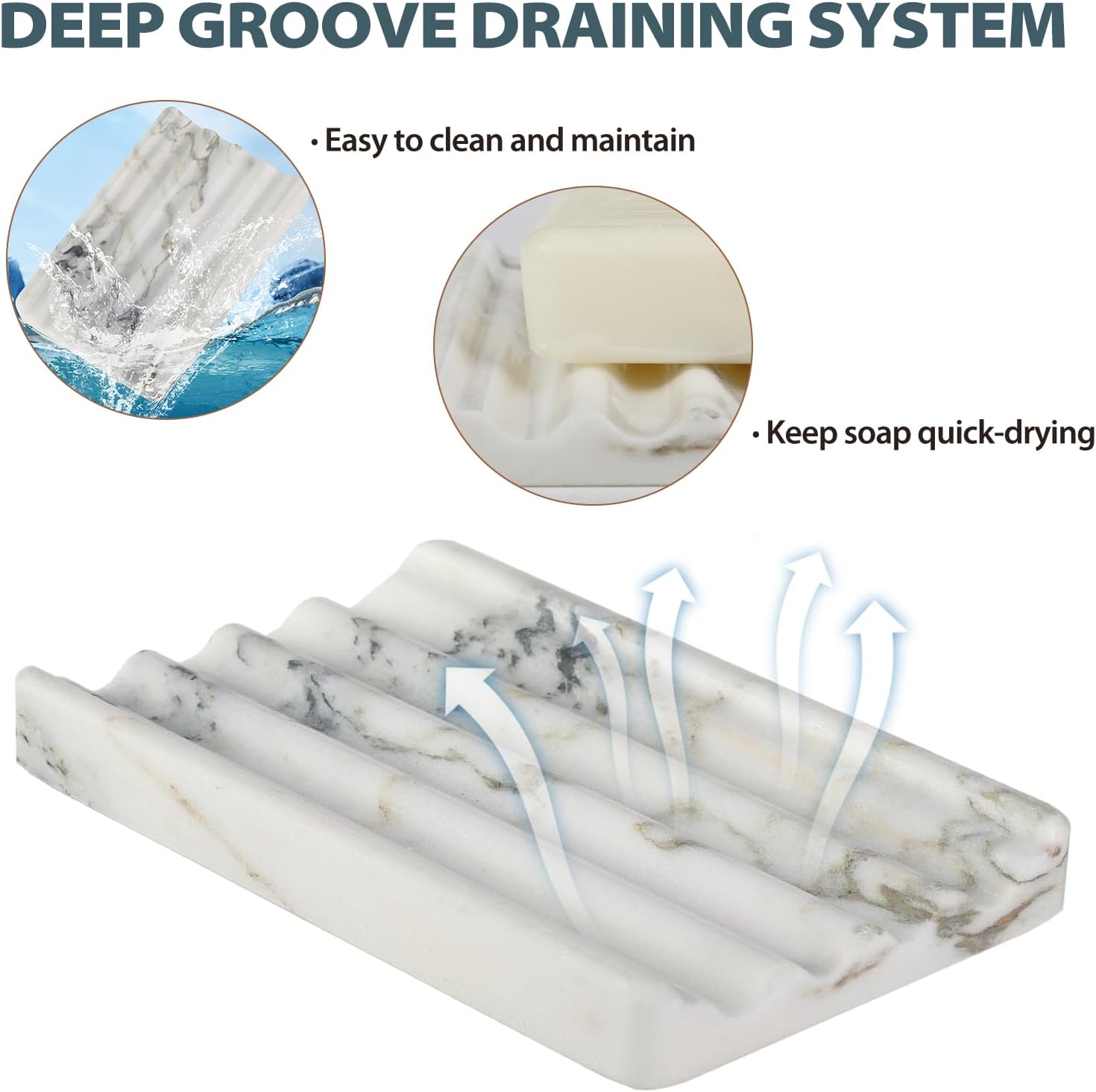 - Dual Application: Our marble soap saver is designed with deep grooves that serve a dual purpose - to keep your soap bar dry and to make it easy to pick up the bar even as it becomes thin. You won't have to worry about your soap bar slipping out of your hand or becoming mushy due to dampness. With its easy-to-clean surface, simply wipe the soap tray with a damp cloth to keep it looking brand new.