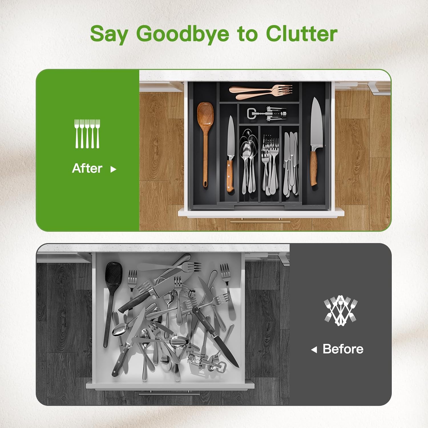 - Expandable and Adjustable Utensil Organizer: Designed with 6-8 compartments, the silverware organizer can save space while accommodating multiple items, which is expandable from 10.31 inches to 16.54 inches wide with smooth sliding.