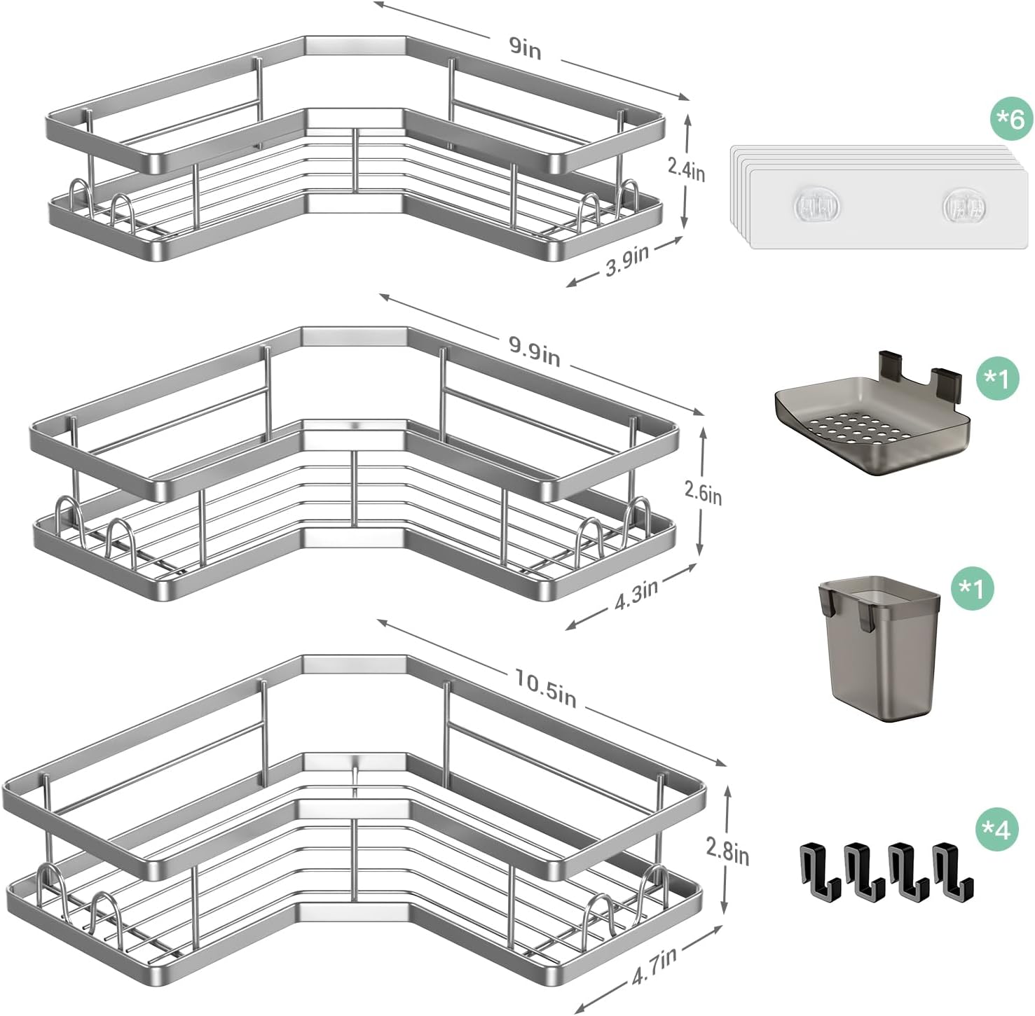- [Space-Saving & Stylish Shower Caddy]: Upgrade L-Shaped corner shower caddy is designed for making great use of corner space. Great shower organizer can organize most toiletries in the bathroom and help to make your shower neat and clean. Shower shelf hold a lot of products and are great for keeping shower tub free from clutter.