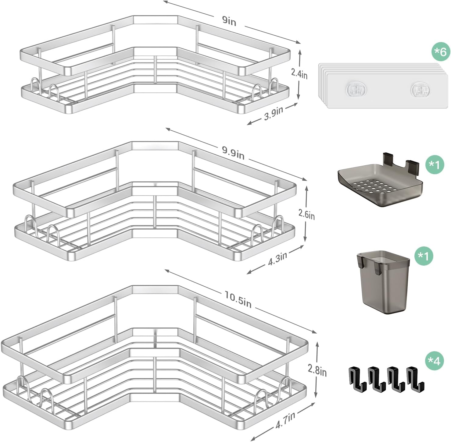 - [No Drilling & Easy installing Bathroom Caddy]: No tools or drilling is required. Shower caddy corner are easy to install with the large-area adhesive. Simple installation: First, clean and dry the wall surface before installing. Second, draw a line with an erasable marker to mark the position where the adhesive will be placed. Third, stick the adhesive hooks to wall. Finally, place shower corner shelf on the adhesive hooks.