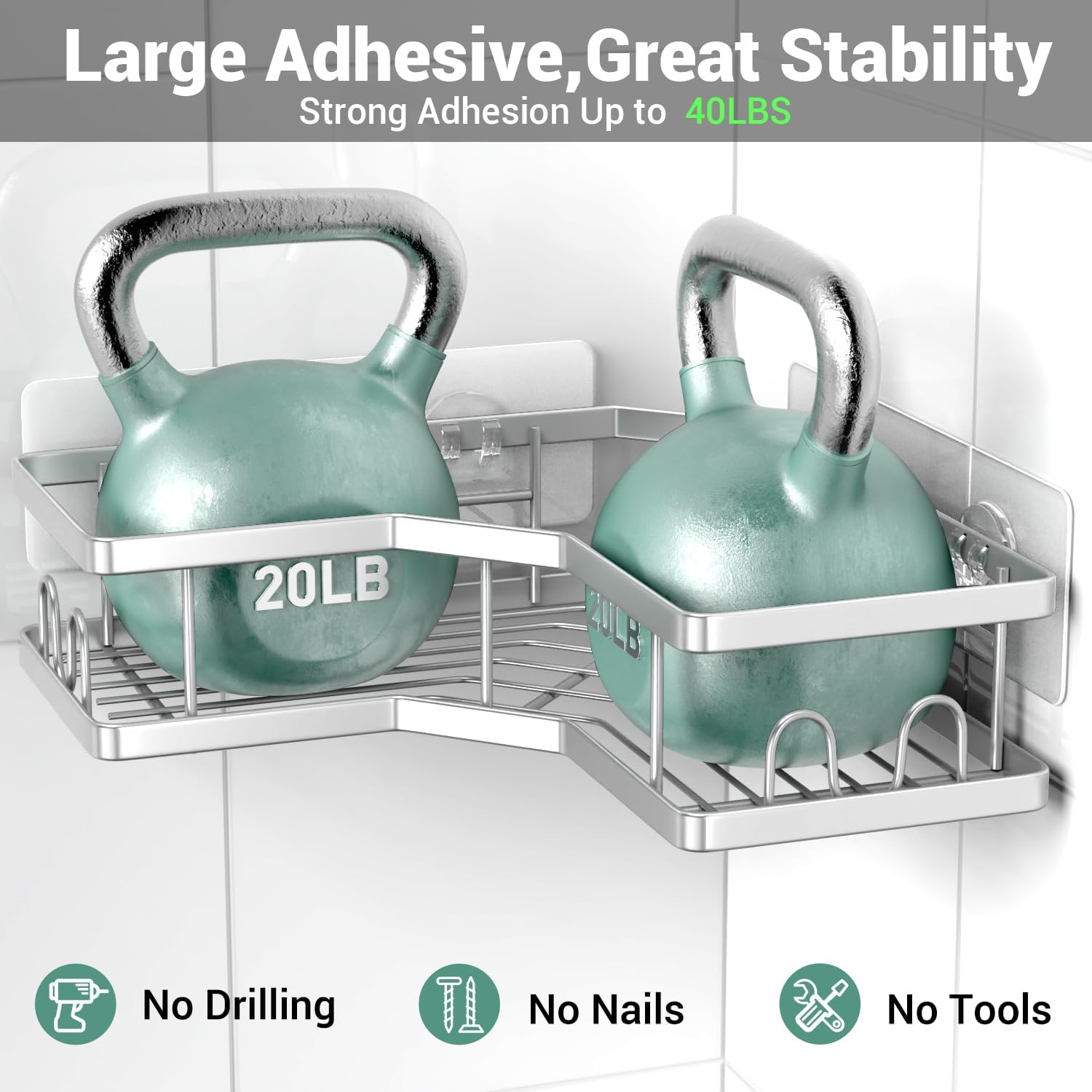 - [Sturdy & Strong Adhesive Hooks]: The adhesive strips are super sticky on flat surfaces and hold up to 40 lbs. Shower shelves is extremely strong and durable to hold big bottles, such as gallon size shampoo and conditioner, body wash and other shower bottles. Please note: Shower rack fits 90 degrees wall corner only, not suitable for rounded or curved corner space.