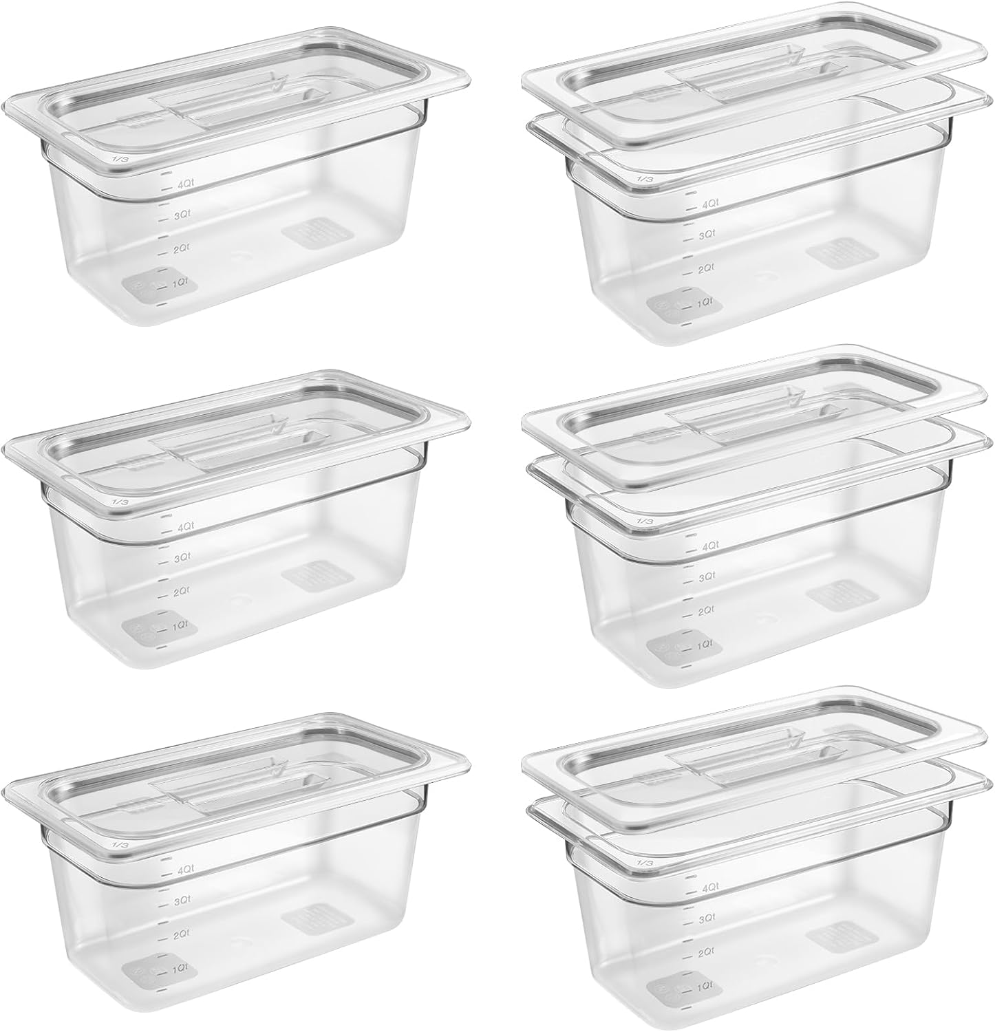 6 Pack 1/3 Size 6'' Deep Clear Food Pans with Lids, Commercial Food Pans Polycarbonate Transparent Food Storage Containers, Stackable Plastic Pan with Capacity Scale, Restaurant Supplies Hotel Pan