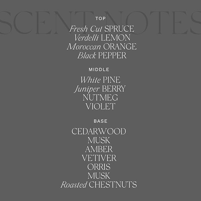 - Wonder of the Forest: Freshly-cut branches of evergreen trees mingle with bursts of grown-up citrus top notes for a refined twist; an undercurrent of a warm woods accord imparts an ambery softness