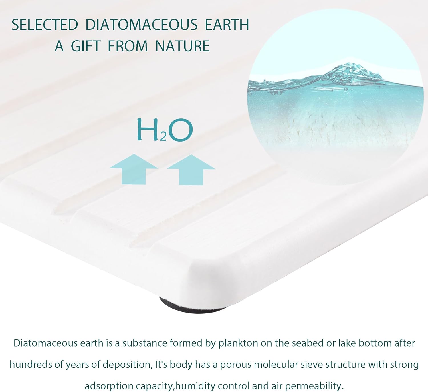 - Made from natural Diatom mud and plant fiber, small holes within diatomite enable it have amazing water absorption. They could absorb water and gets dry in a few minutes. It makes the Bathroom Counter top more dry and tidy.