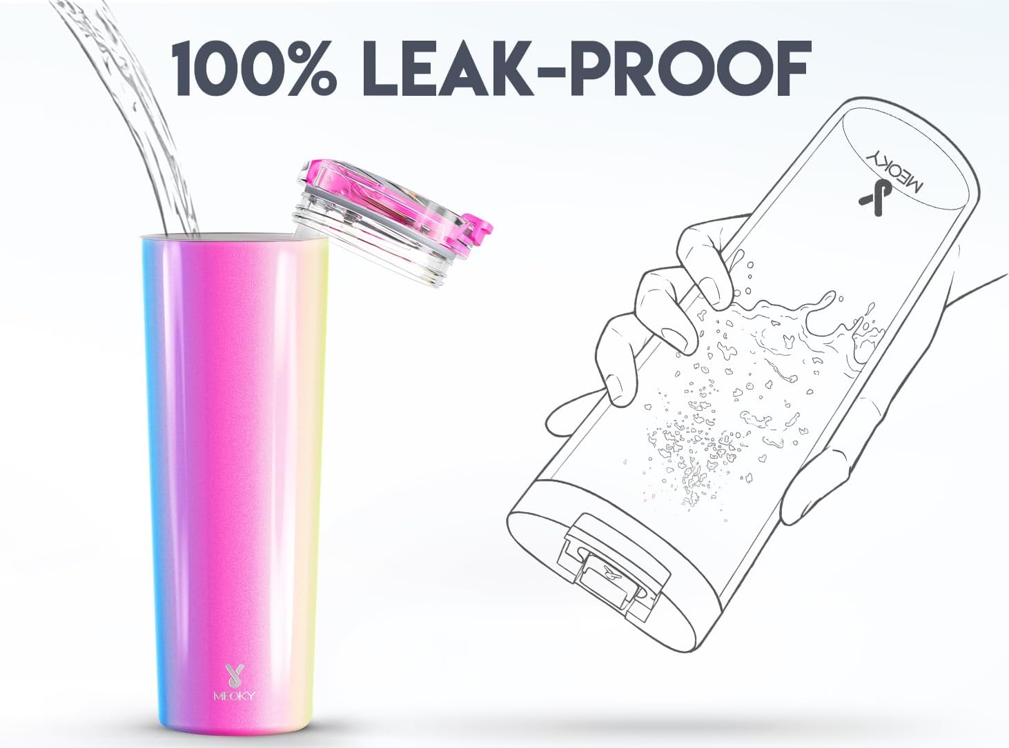 - 100% LEAK-PROOF. The 2-in-1 straw and sip lid offers 2 ways of drinking, and does a good job at being fully leak-proof with the double-thread and screw-on design. (The built-in straw is heat-resistant.)