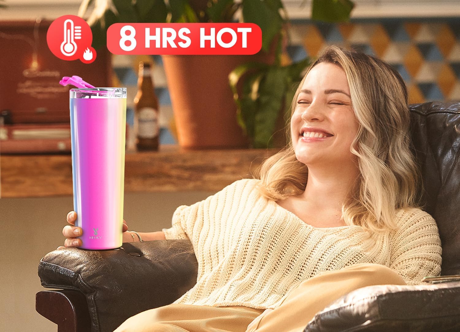 - KEEPS HOT. With double-wall vacuum insulation, Meoky travel mug keeps hot for 8 hours and cold for 24 hours.