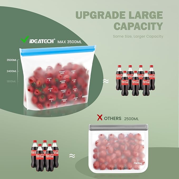 - Stand Up Design , Larger Capacity: The reusable bags can stand up in the fridge which will make your fridge organized, can storage meats meal, vegetables, frozen foods, cereal, fruits