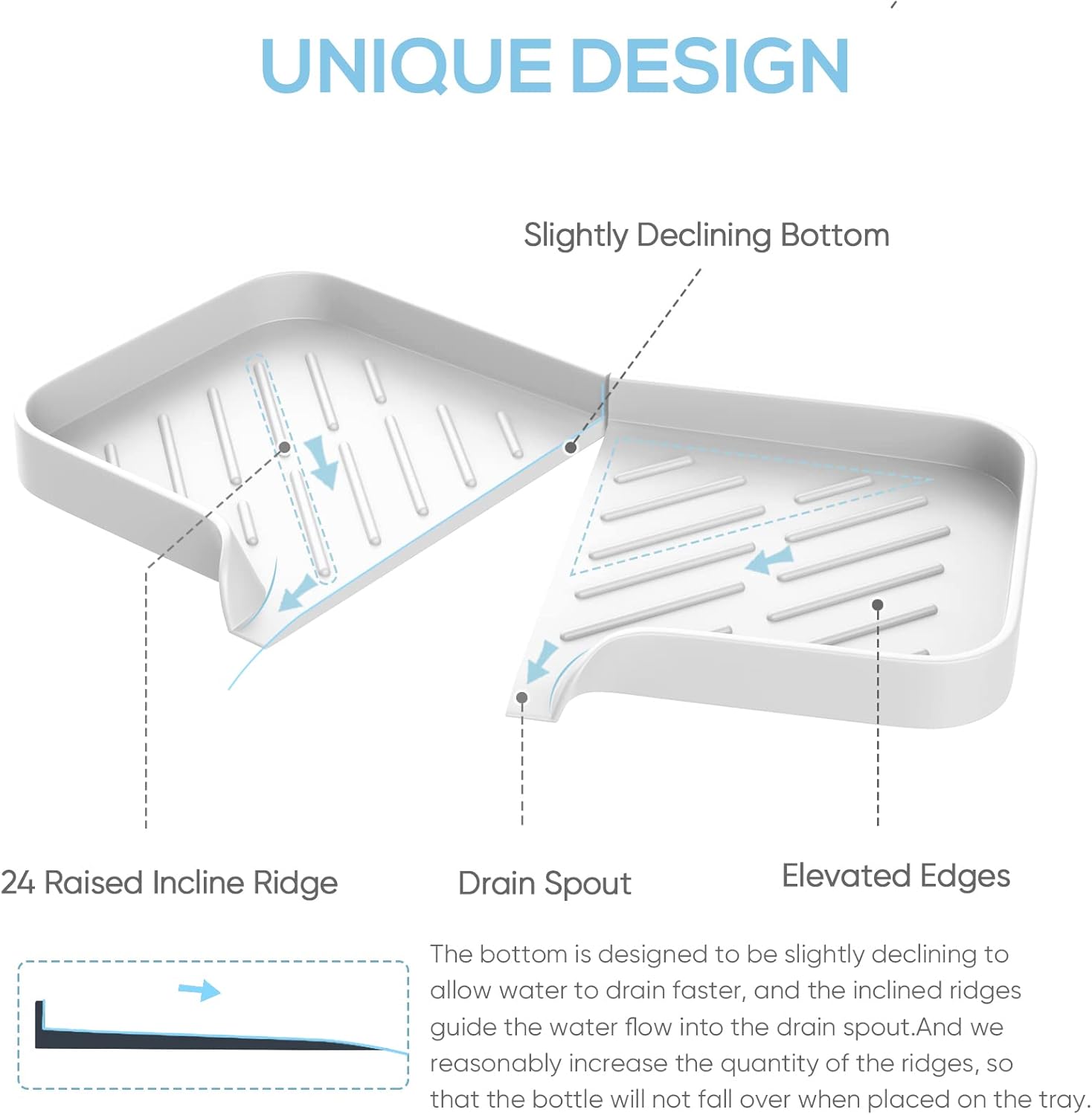 - 【Self Draining Kitchen Sink Tray】 Unique self-draining design, the bottom of the soap tray for kitchen sink is designed to be slightly declining to allow water to drain faster, the inclined ridges guide the water flow into the drain spout.