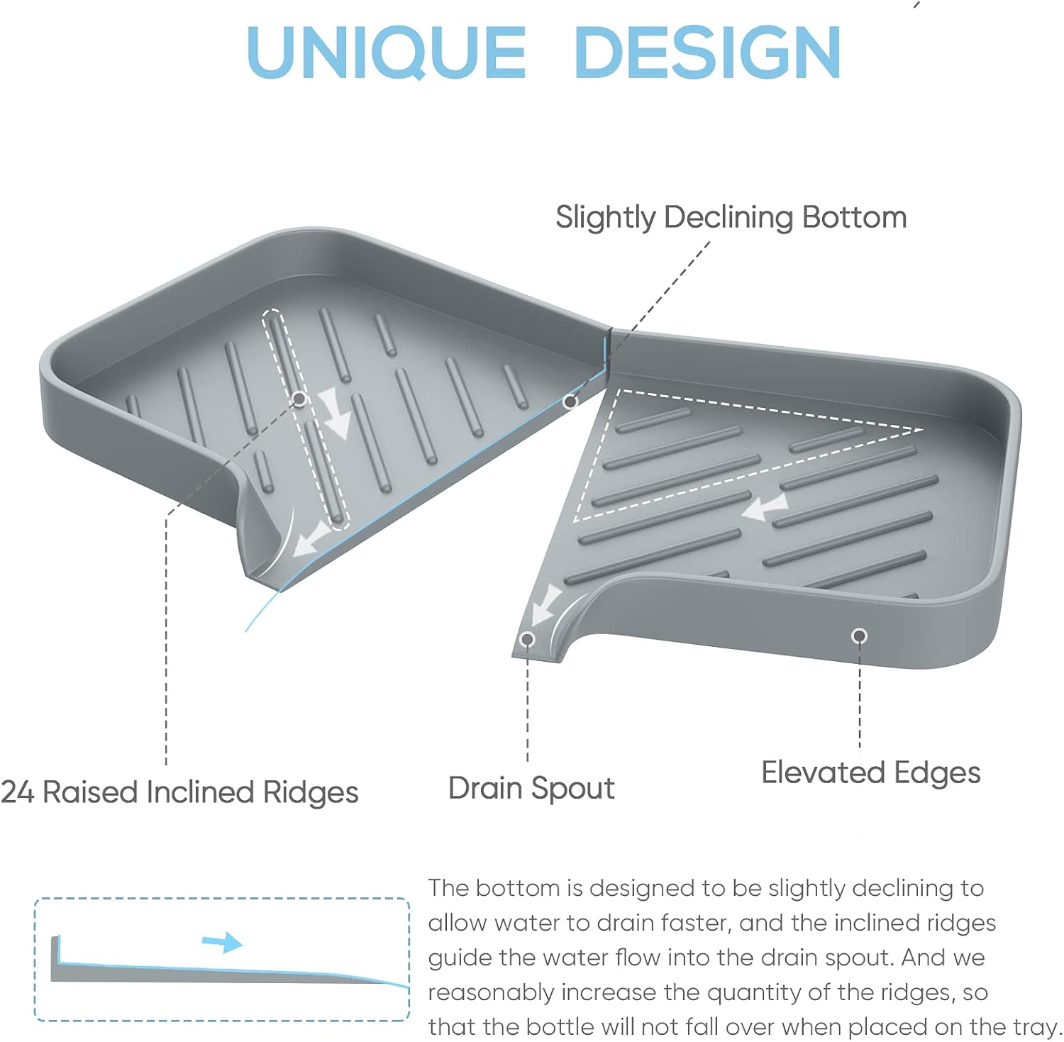 - 【Upgraded Silicone Kitchen Sponge Holder】The unique design and food-grade silicone material are suitable for any counter top, it helps keep the counters dry and organized. This silicone tray is non slip and very easy to clean. The upgraded self-draining design will drain the water faster.