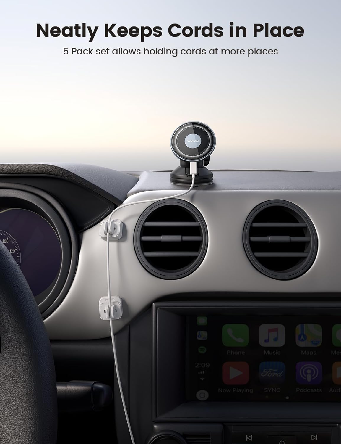 - Make Your Life Easier: Using this cable clips holder to tidy up your cluttered cords, make your numerous cables nicer, organized, and safer. 5 Pcak clips allows you to use in more places. Like desktop, tableside, table corner, office, wall or inside the car