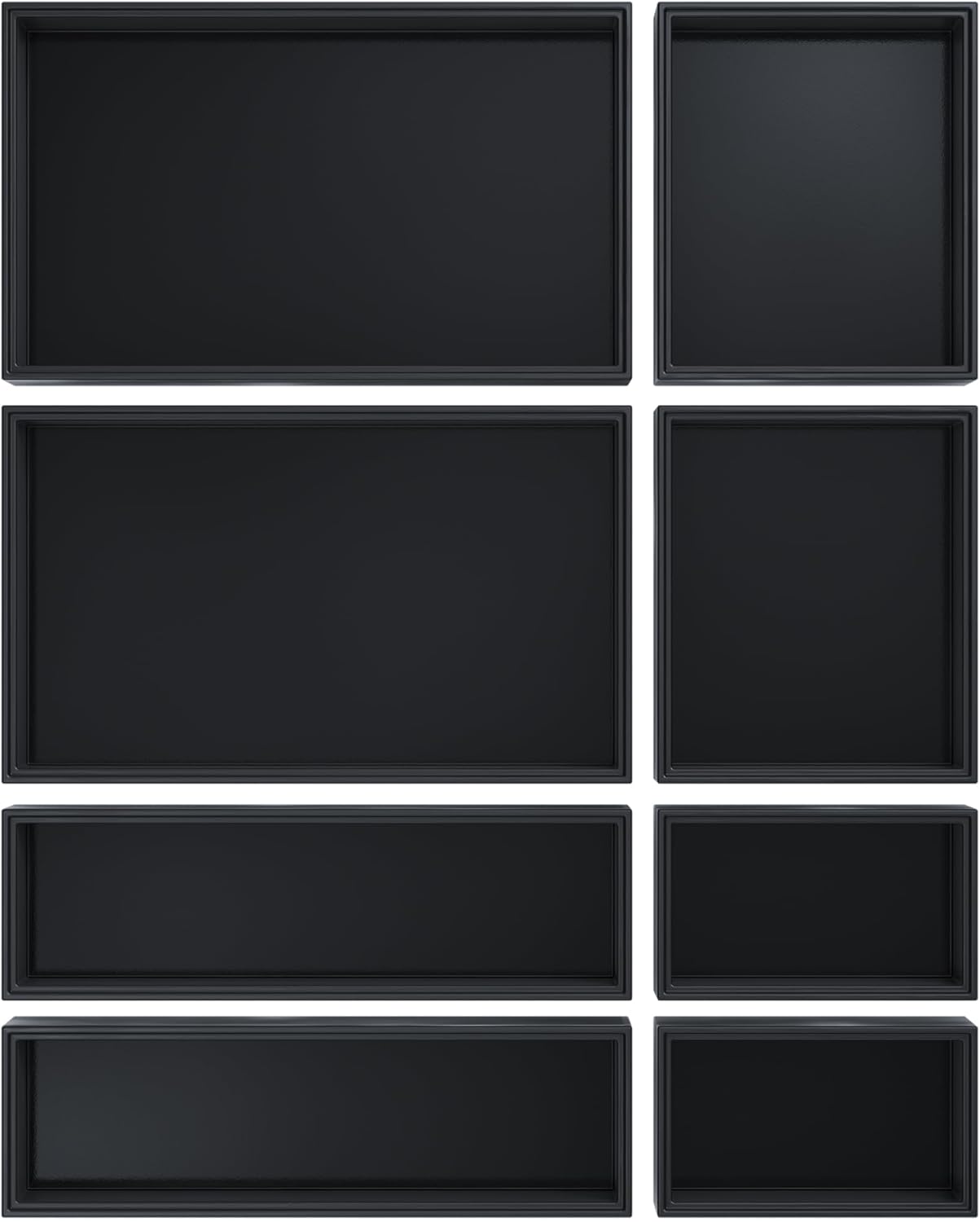 - Stackable Tool Box Organizer for Garage Organization - This black drawer organizer set contains 4 different sizes (totally 8 pcs)for meeting your different needs: 10" x 6", 5" x 6", 10" x 3", 5" x 3". With groove design, our tool box organizer can be stacked as needed. Save your desk space when using it on the countertop, and you can also make full use of the height of the space in the drawer