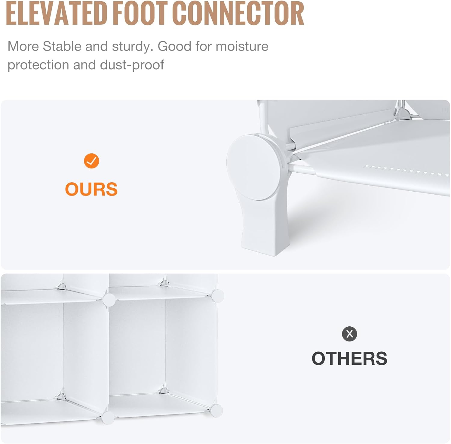 - 【Stable Structure】The storage shelves each size is 11.8" x 11.8" x 11.8" (30 x 30 x 30cm), consisting of thickened polyethylene plastic sheet, sturdy metal frame and high quality ABS resin connectors.Please note: it fits storage bin that is smaller than 11.5*11.5 inches. Each cube of the wardrobe clothes organizer holds up to 22 lb. This is a very stable structure that won’t tip or fall over .