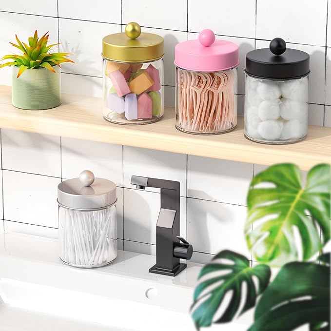- COMPACT BATHROOM CONTAINNERS: Goramio apothecary jars are made of superior-quality solid glass, sturdy and beautiful. Compared to cheap plastic, glass q-tip holders are more sturdy and upscale. Good for storing small things such as cotton balls, cotton swabs, cotton rounds, floss picks, tampons, bath salts, hair ties, makeup brushes, beauty eggs, face brushes, crayons, candy, and paper clips, etc