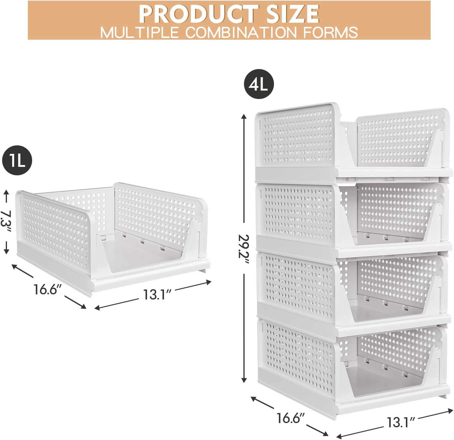 4 Pack Stackable Closet Storage Basket - Stackable Storage Bins, Multifunctional & Foldable Closet Organizer, Wardrobe Cupboard Space-Saving Clothes Storage Hat Organizer, White