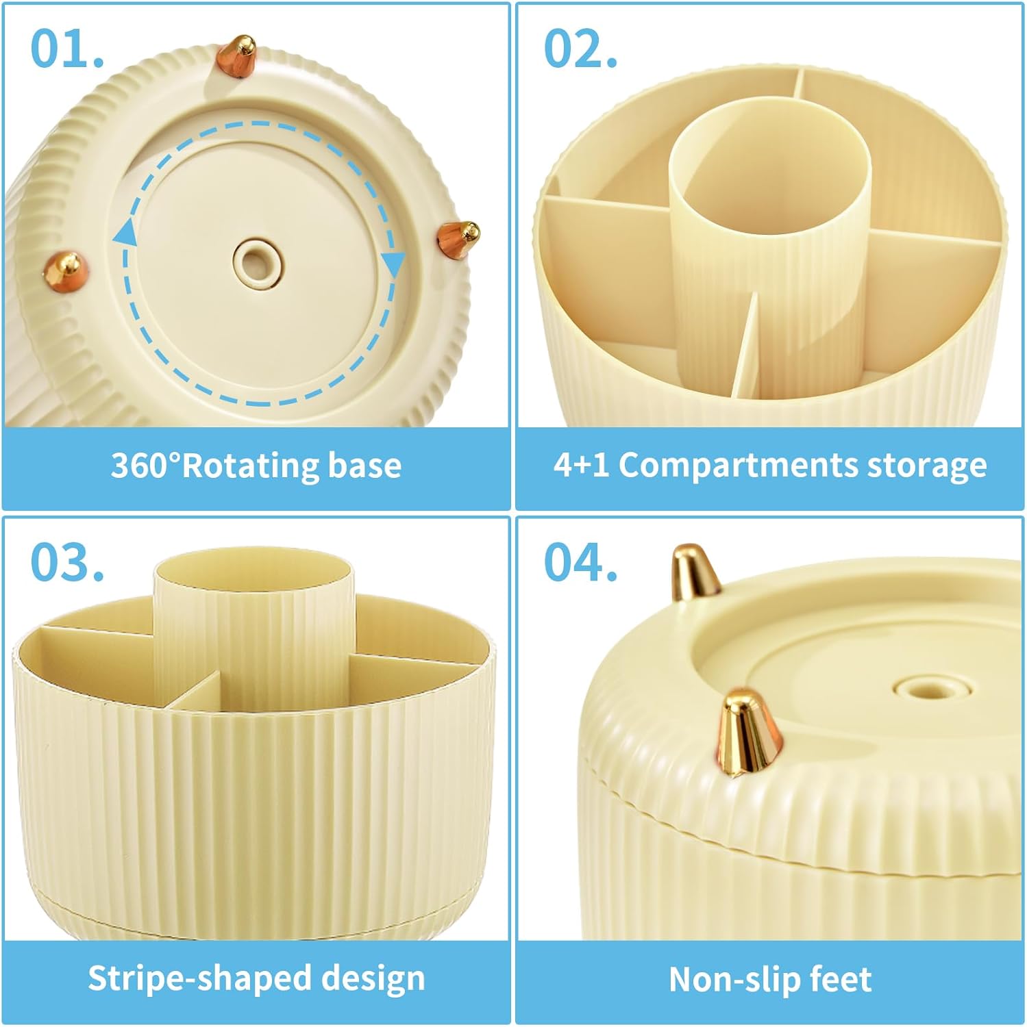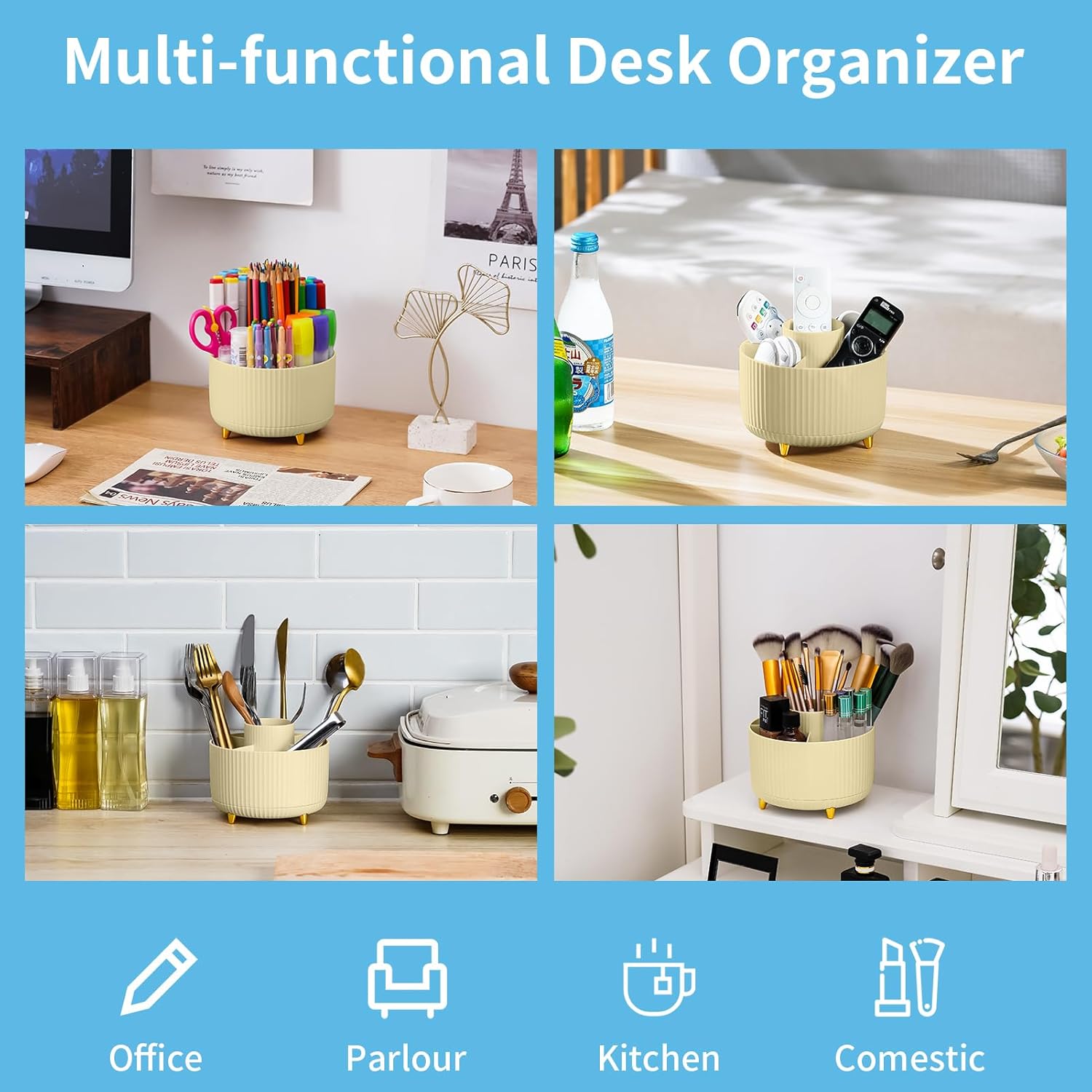 - 【Multipurpose Desktop Organizer】: This rotating storage organizer is perfect for pencils, cosmetics, bathroom necessities, toiletries, and even kitchen utensils. Try it in your craft room, playroom, laundry/utility room, and even inside bathroom cabinets or under the sink; Store extra office supplies like painting pens, correction tape, scissors, TV Remote, and more; Even headphones or a charger will no longer be lying around in the future! Maximize your vertical space and keep your desk clear.