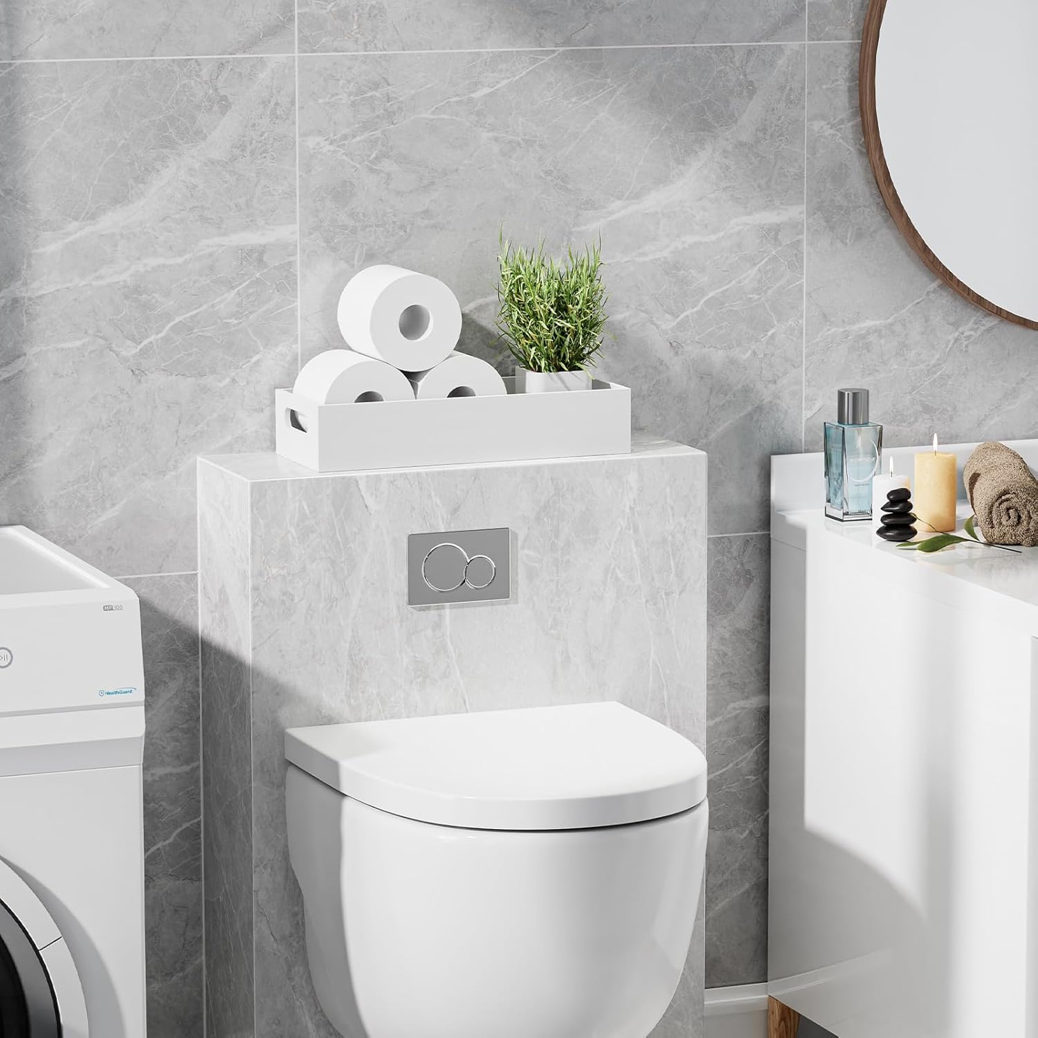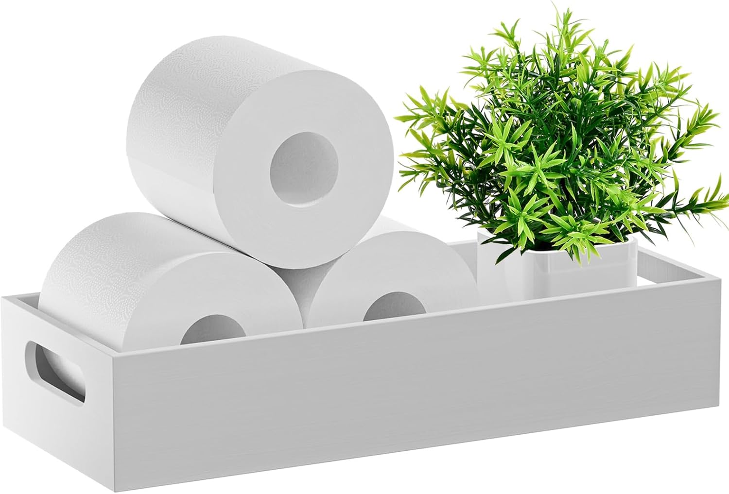 VITVITI Bamboo Toilet Paper Holder Storage, Bamboo Tray for Bathroom with Handle, Toilet Tissue Holder Organizer Basket Container for Toilet Tank/Kitchen Counter, Natural, White