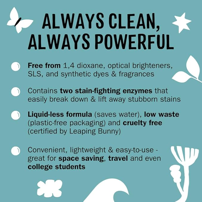 - Liquid-less formula (saves water), low waste (plastic-free packaging) and cruelty free (certified by Leaping Bunny)