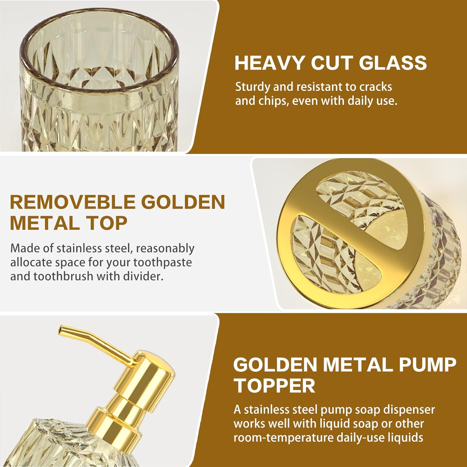 - 【DURABLE HEAVY CUT GLASS】Unlike other fragile ceramic and inferior plastic bathroom accessories on the market, this bathroom sets accessories are made from high-quality glass material, which is sturdy and resistant to cracks and chips, even with daily use. The brown bathroom accessories set also has an easy-to-clean surface, making it simple to maintain and keep looking like new.