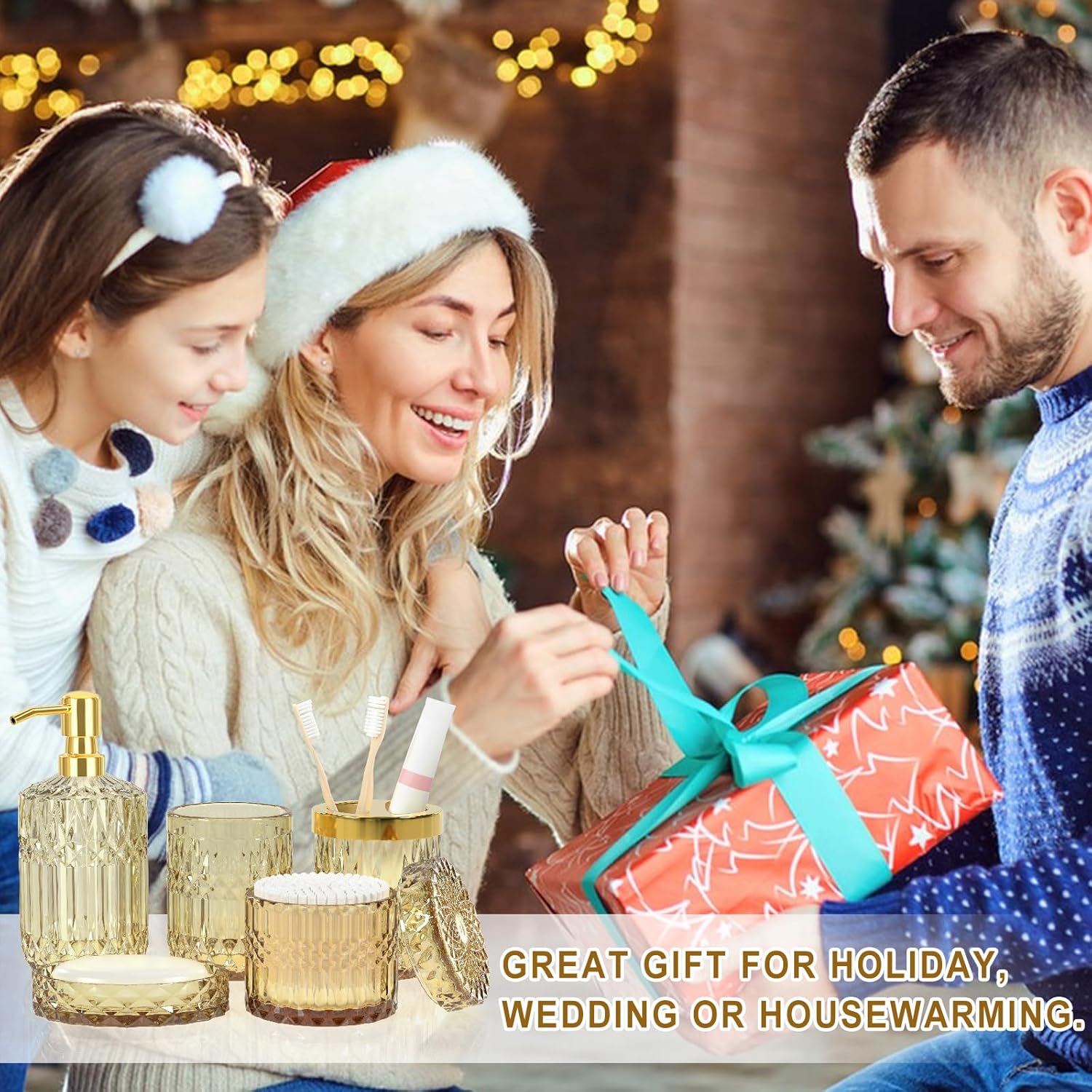 Brown Bathroom Accessory Set 5PCS - Amber Glass Bathroom Accessories with Toothbrush Holder Set, Soap Dispenser, Soap Dish, Tumbler, Cotton Swab Jars, Vintage Bathroom Decor Set Housewarming Gift