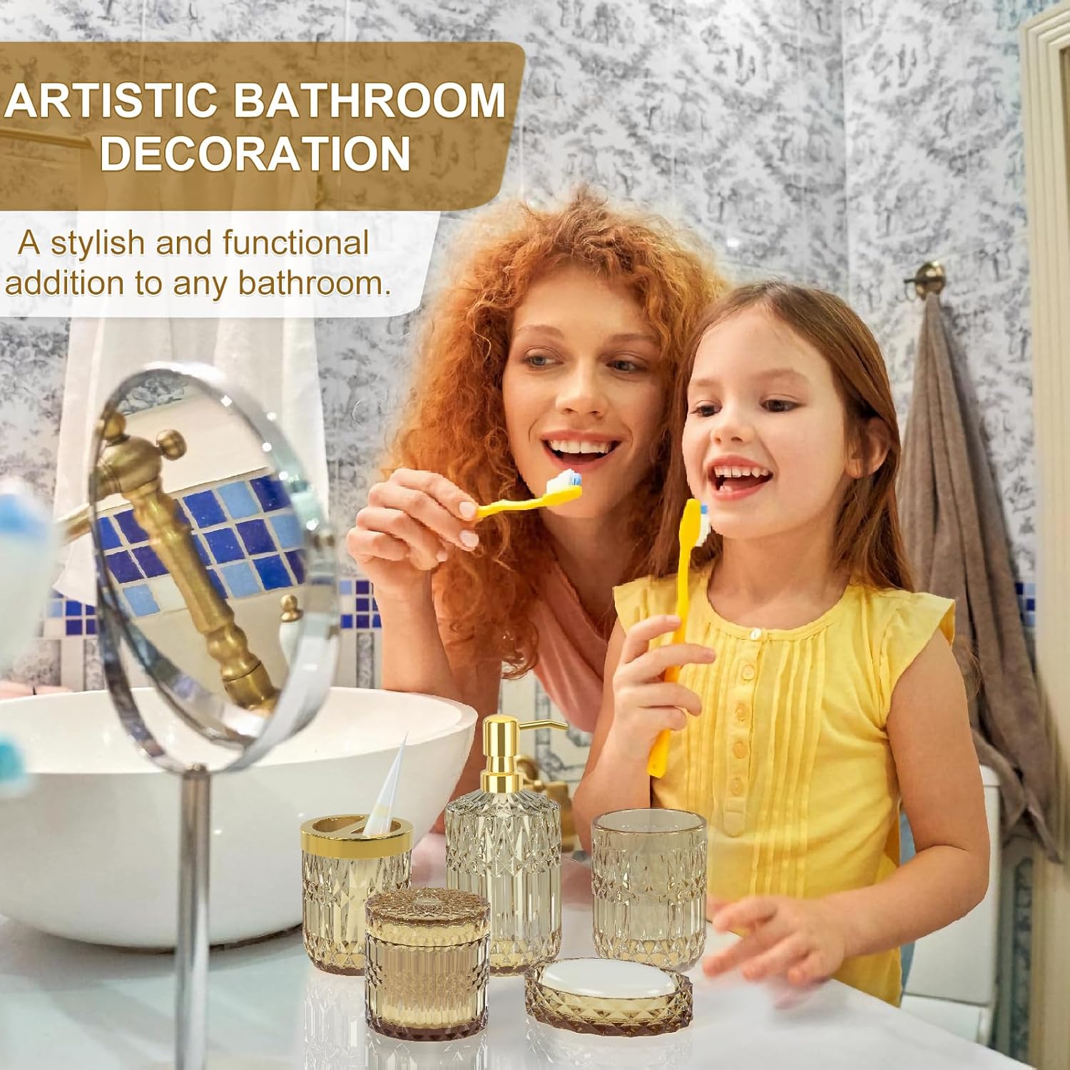 - 【WONDERFUL BATHROOM STORAGE SOLUTION】Do you want an elegant and elevating storage solution for bathroom countertops? Our amber bathroom accessories include a soap dispenser and toothbrush holder, soap dish, tumbler, and cotton swab jar, perfect for storing your toiletries or cosmetics, and keeping your bathroom counter fully organized and neatly.