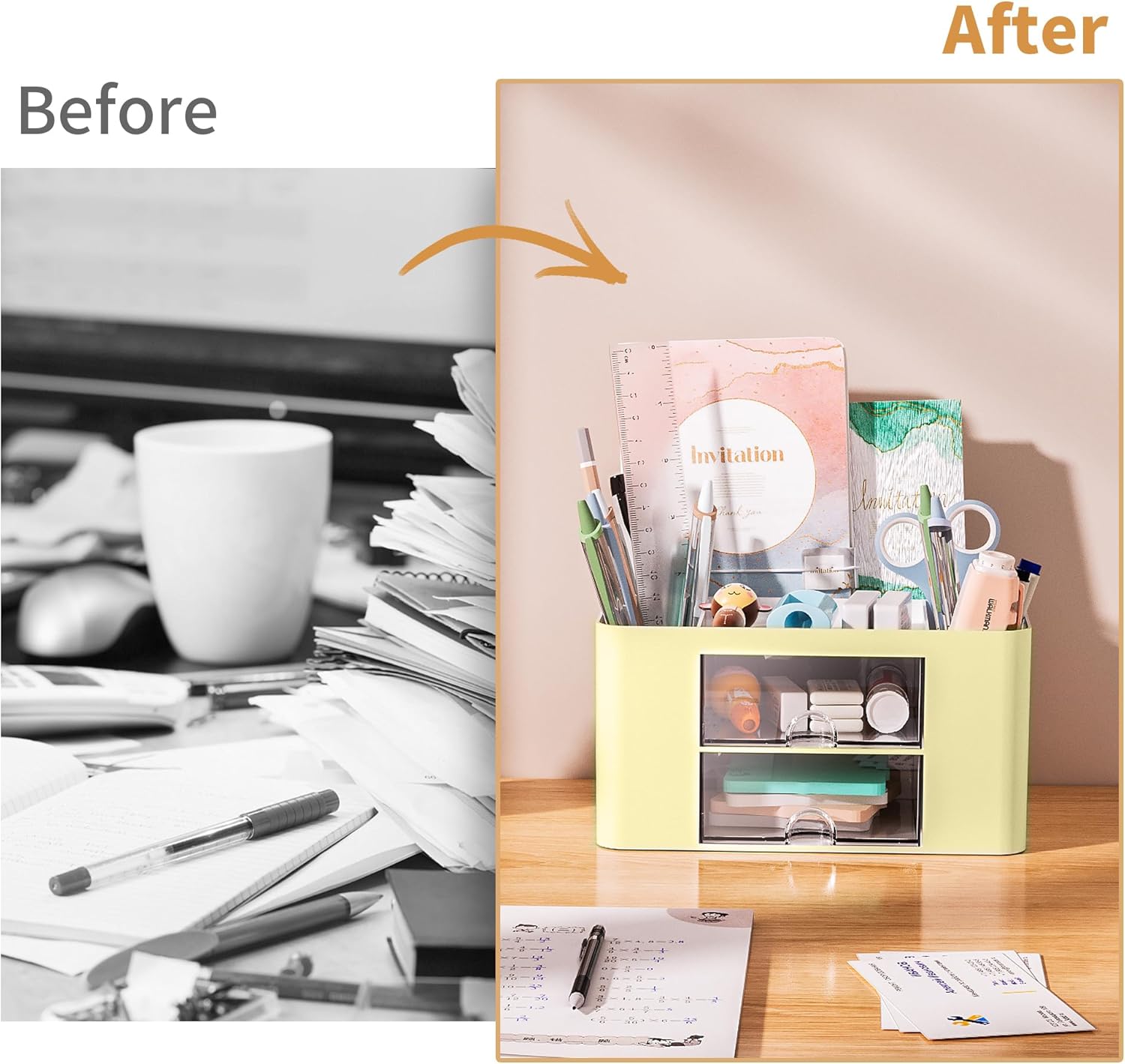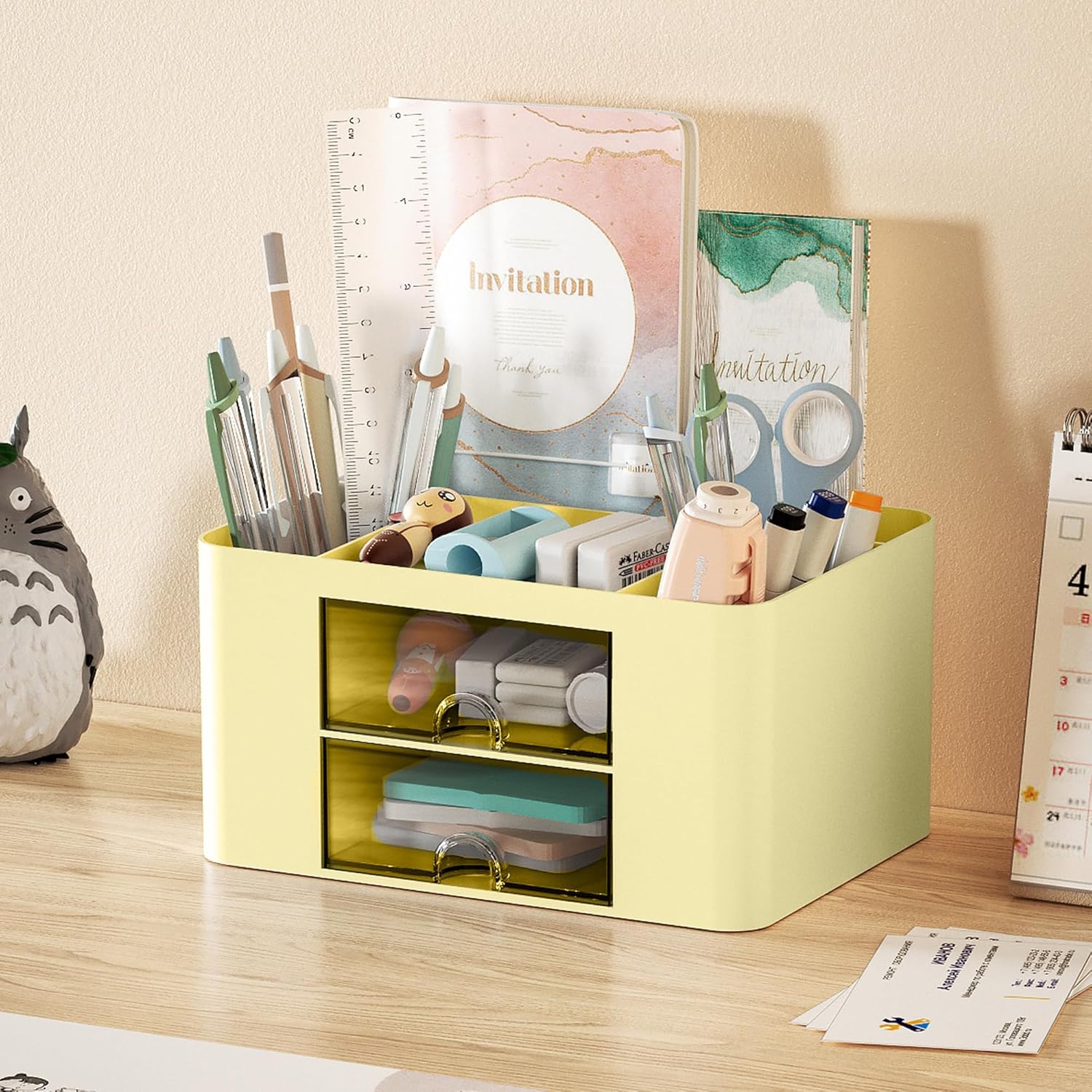 Marbrasse Pen Organizer with 2 Drawer, Multi-Functional Pencil Holder for Desk, Desk Organizers and Accessories with 5 Compartments + Drawer for Office Art Supplies (Yellow)