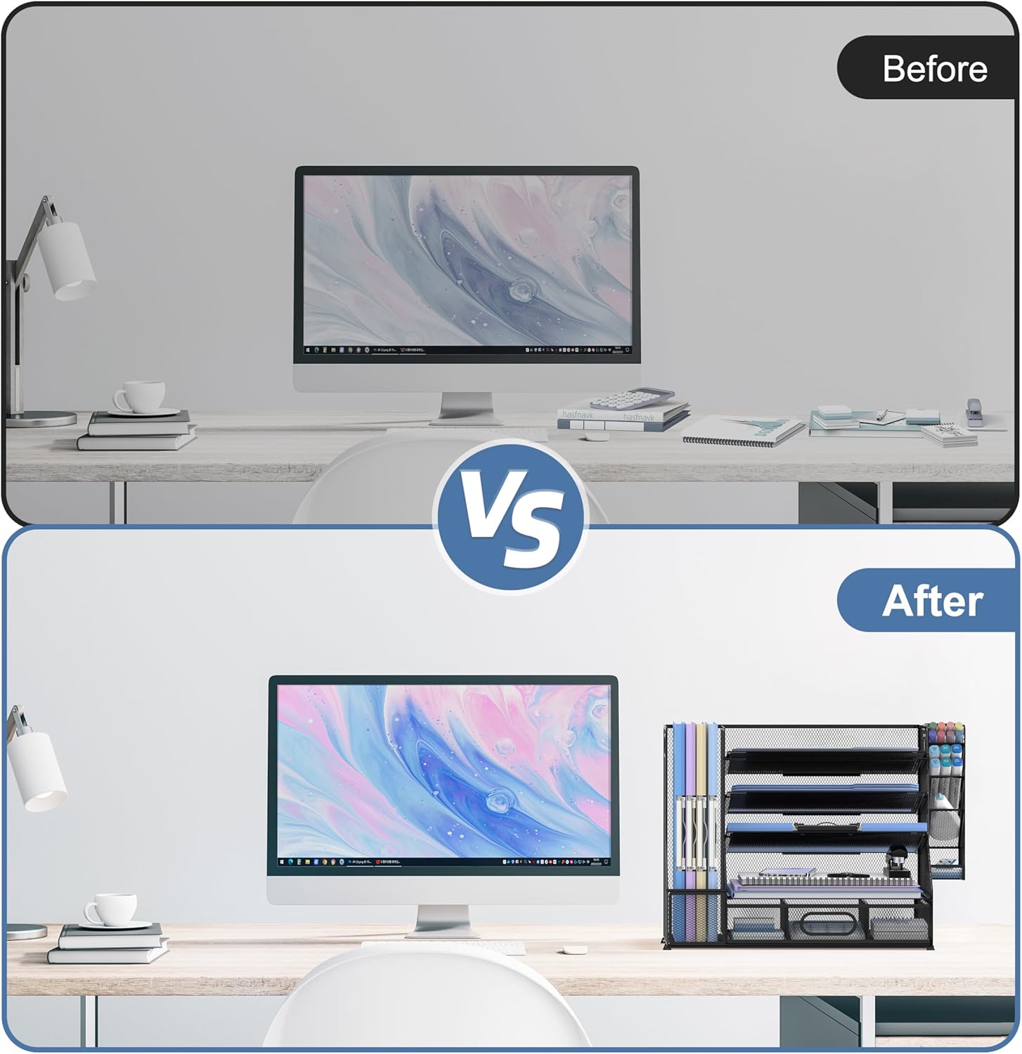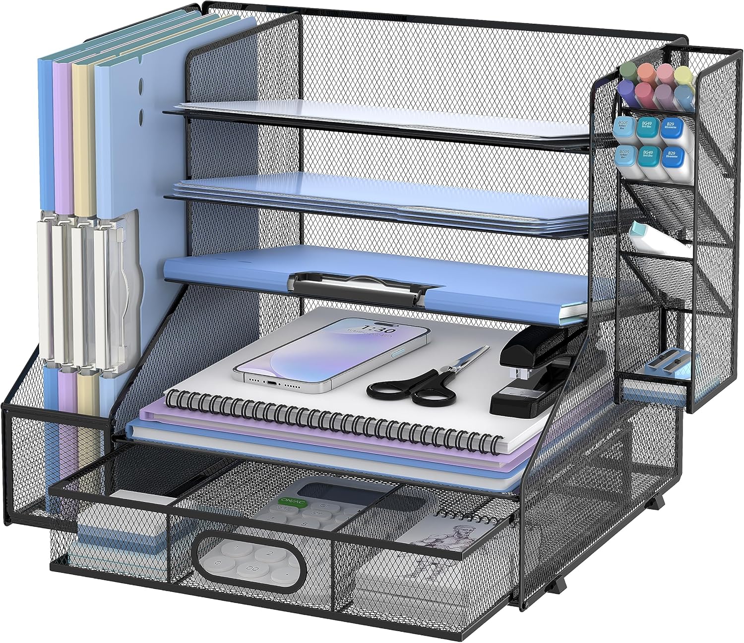- [Save Space and Time] Large-capacuty vertical file holder can hold more of your file folders and books. The paper tray organizer is very suitable for storing books, magazines, letters, and A4 paper. The hanging pen holder is very convenient for you to put pencils and pens, and the large capacity drawer can hold all other office supply accessories, such as sticky notes, scissors, staplers, and so on.