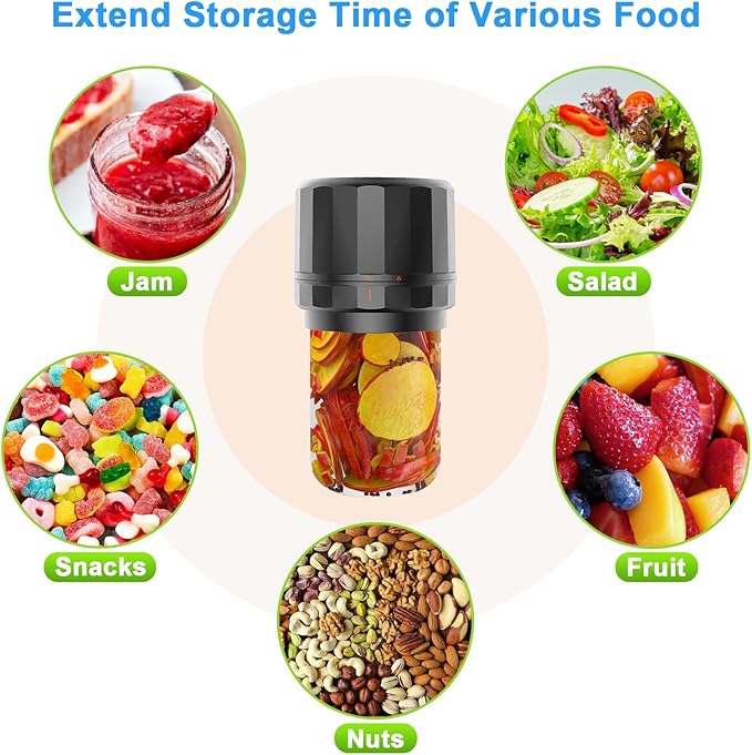 - Powerful Suction &2000mAh Battery - Featuring a high-performance motor with -80 Kpa suction power, our mason jar vacuum sealer boosts sealing efficiency by 40%. The 2000mAh battery seals approximately 180 jars per charge, with 1.5 hours of continuous operation. The built-in display shows battery status and progress.