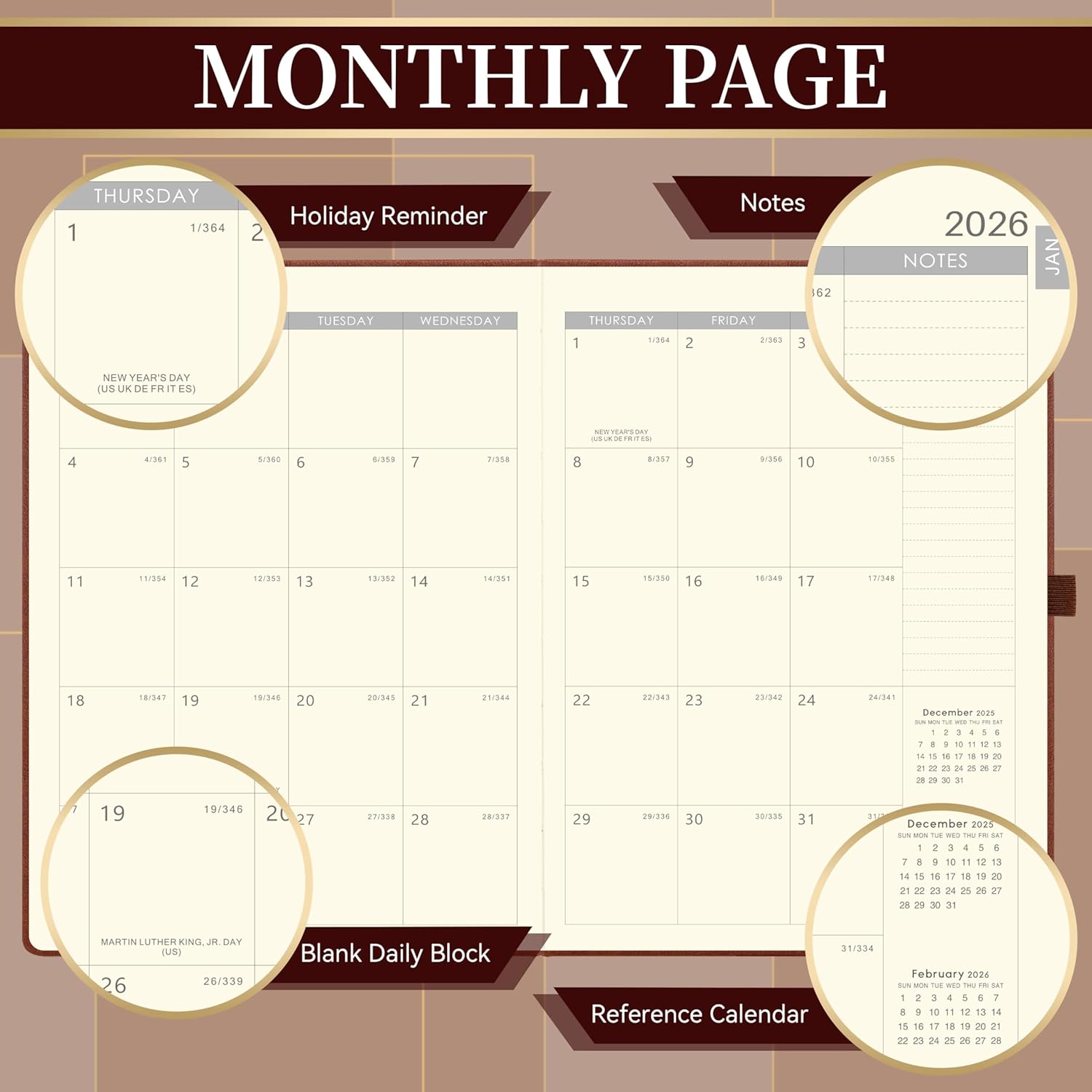 - Monthly Pages - Each monthly spread of the 2026 planner weekly and monthly contains an overview of this month and a notes section. There are ruled daily blocks + Julian Dates + Holidays Reminders. The past, present and future monthly reference calendars on the page for long-term planning and the note section for your priorities of the month.