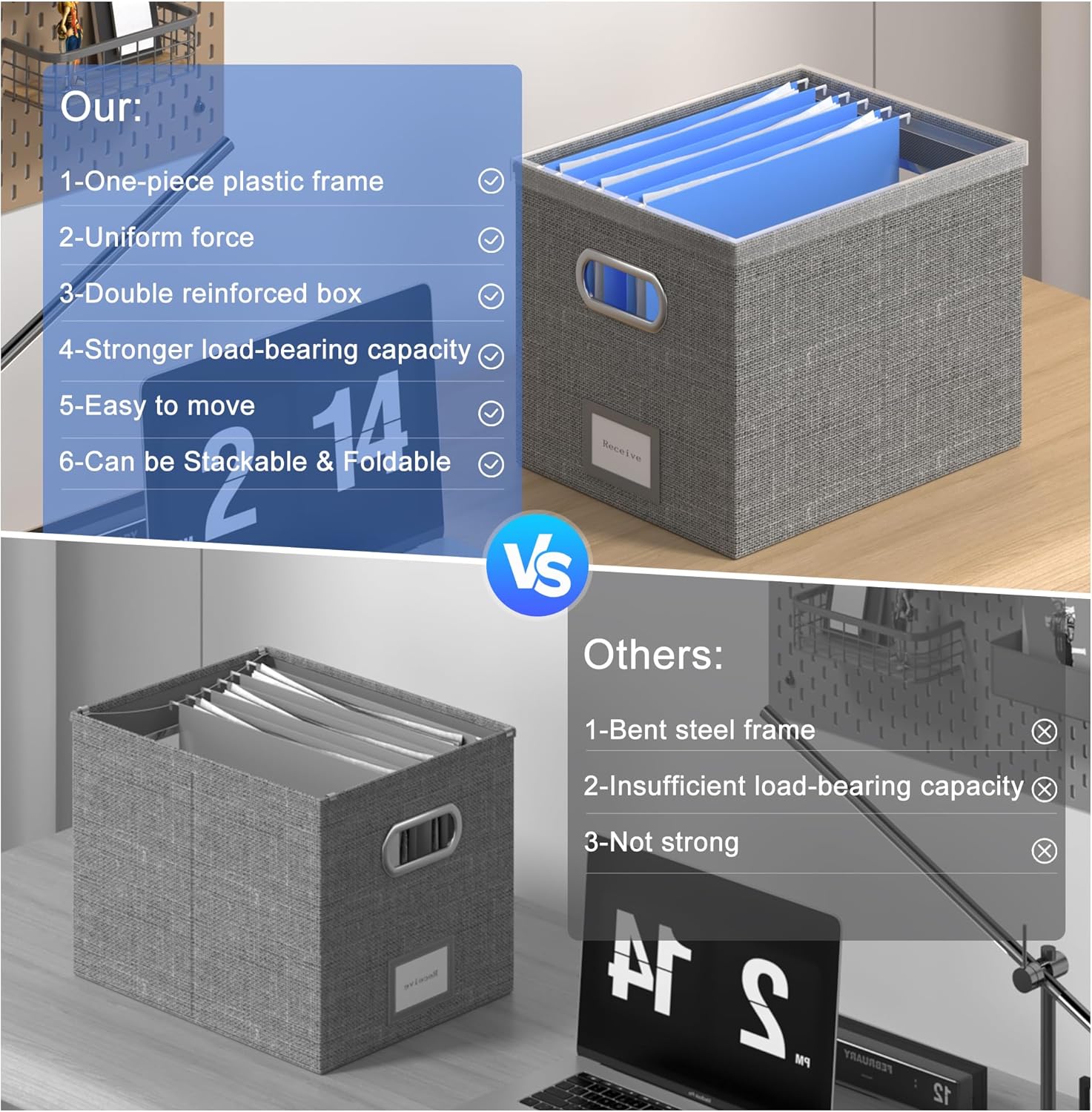 - [Double Reinforcement File Box ]- We believe you deserve better quality, Our file box organizer is not only exquisite in appearance and fine workmanship,but also stronger. We use the bottom into the bottom plate and the top into the integrated one-piece plastic frame slides to stabilize the box. You can move the file boxes freely without worrying about the box being unstable.