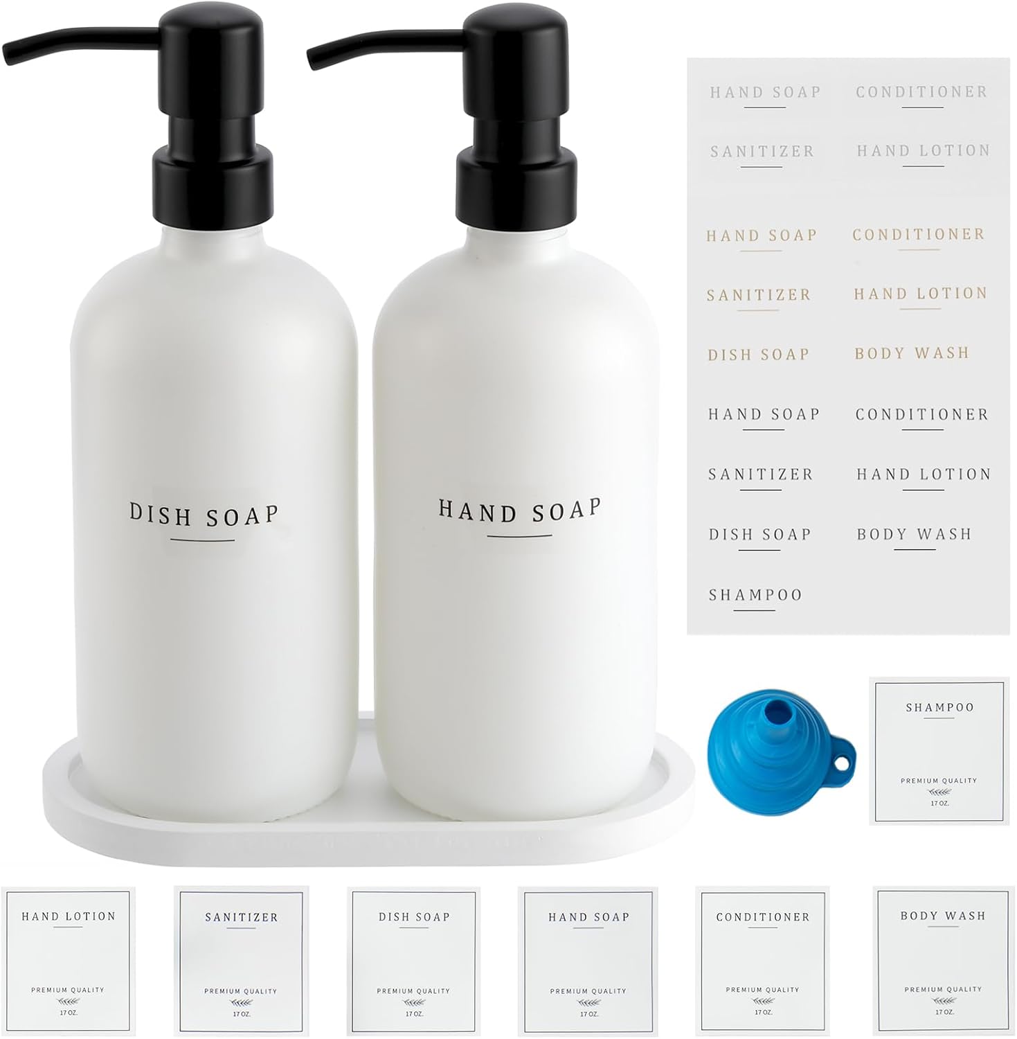 - A practical and aesthetically pleasing addition to your home: This soap dispenser set contains 2 reinforced hard glass bottles with sleek and stylish stainless steel pump heads for your liquid soap; hand soap, dish soap, hand lotion, body wash, shampoo, conditioner labels, 1 silicone funnel, 1 waterproof non-slip tray, this set has transformed mundane routines into moments of indulgence and style.