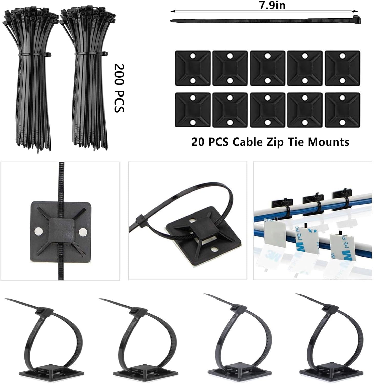 - Cable Management Organizer:4 Cable protector 20in L x 0.4in w, 20 Cable Zip Ties,30Cable Clips,11Cord Holders,200 Cable Fastening Ties:6 in x 0.12 in,20 x Cable Zip Tie Mounts 3.54L x 1.1inW, 2 Self Adhesive Cable Tie Rolls,each roll is 39 in,15 Cable Clip Nails