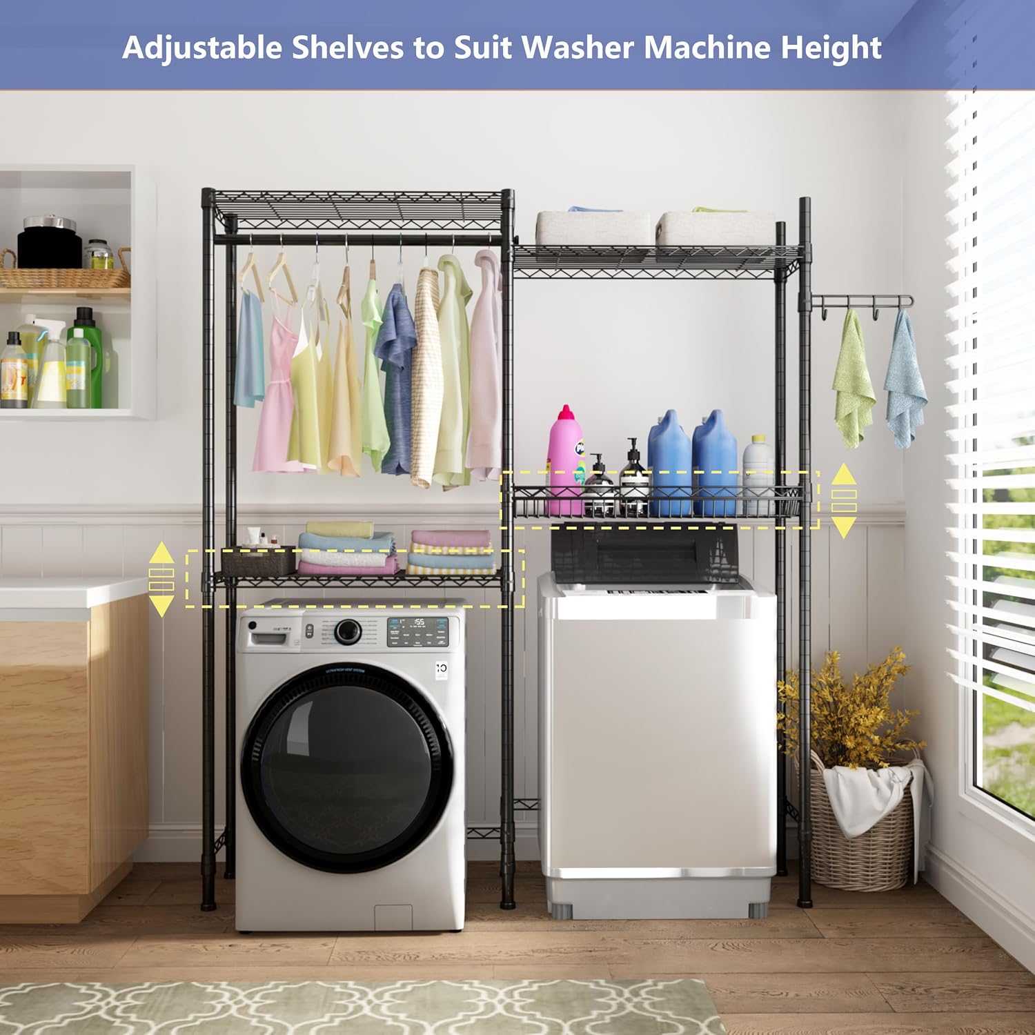 - Space-Saving and Versatile Design: Elevate your laundry organization with our multi-functional storage solution. The overall dimensions of 63.5”W x 13.4”D x 77”H ensure a perfect fit for washers and dryers up to 30.5" in width. This practical rack includes 3 wire shelves, 1 hanging rod, 1 wire basket, and 1 rotatable hook, adding extra space and organization to your laundry room. The upper crossbar design facilitates easy hanging of clothes, while the rotatable hook allows you to hang light clothing, towels, or cleaning supplies(Please note the appropriate size for the washer and dryer and purchase according to the required dimensions)