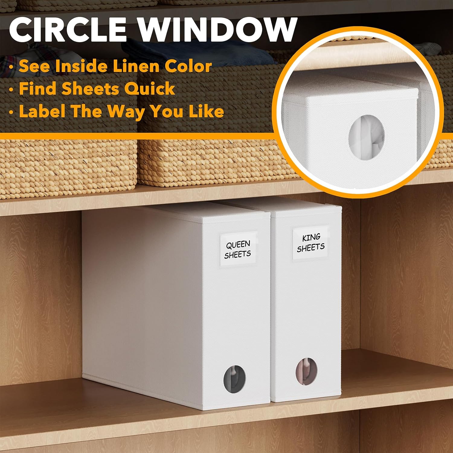 - CIRCLE WINDOW DESIGN - You can see the linen color clearly through the front circle window; This sheets organizer container is beautiful and modern that will fit any home style