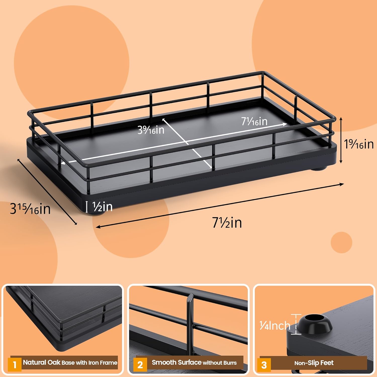 Bathroom Tray for Counter, Oak Wooden 7.5" L Decorative Vanity Tray for Dresser Tops Perfume Jewelry Makeup Candle Soap Sponge Holder for Kitchen Countertop Organizer Coffee Table Decor Bar Black