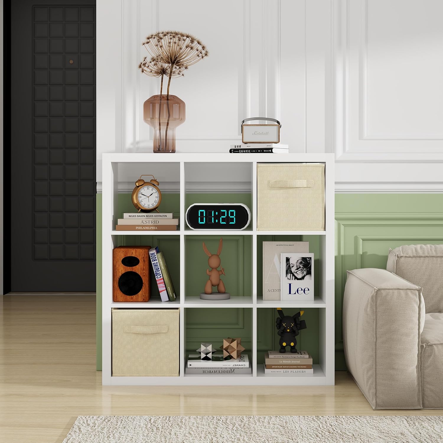 Bookshelf with Storage Bins, 9-Cube Storage Organizer Sturdy Wooden Bookcase Open Book Shelf, Multifunctional Cubicle Rack for Storages & Display, Furniture for Living Room Bedroom Office, White
