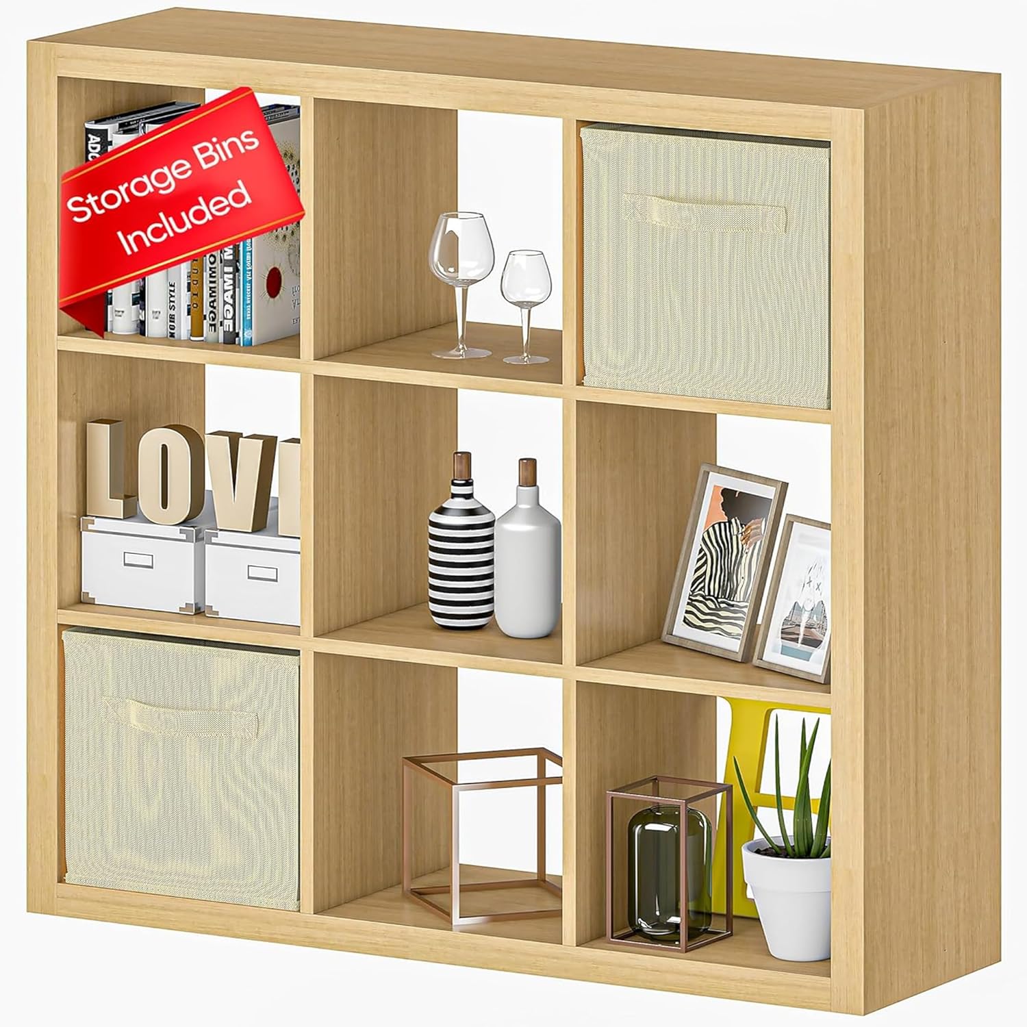 Bookshelf with Storage Bins, 9-Cube Storage Organizer Sturdy Wooden Bookcase Open Book Shelf, Multifunctional Cubicle Rack for Storage & Display, Furniture for Living Room Bedroom Office, Oak