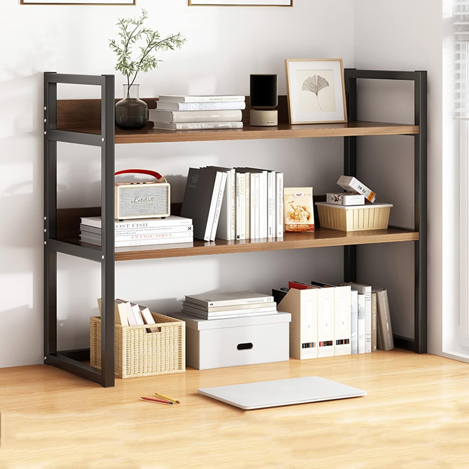 Desktop Bookcase for Computer Desk,2 Tier Adjustable Desk Bookshelf, Wood and Metal Printer Stand Office Supplies Organizers and Storage Display Shelf