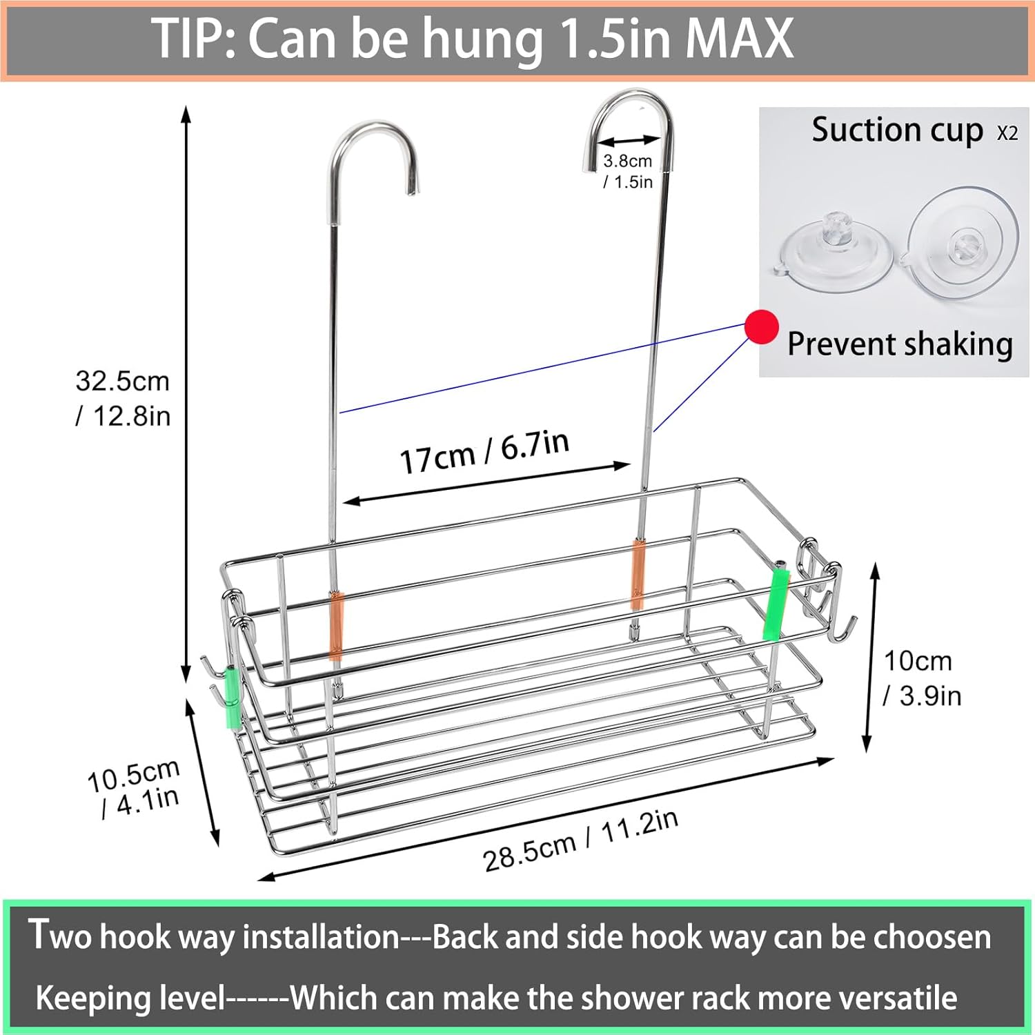 - Size of Shower Rack---Measures 11.2 x 4.1 x 12.8 inches high. It is recommended that hooks be used at locations up to 1.5 inches in diameter