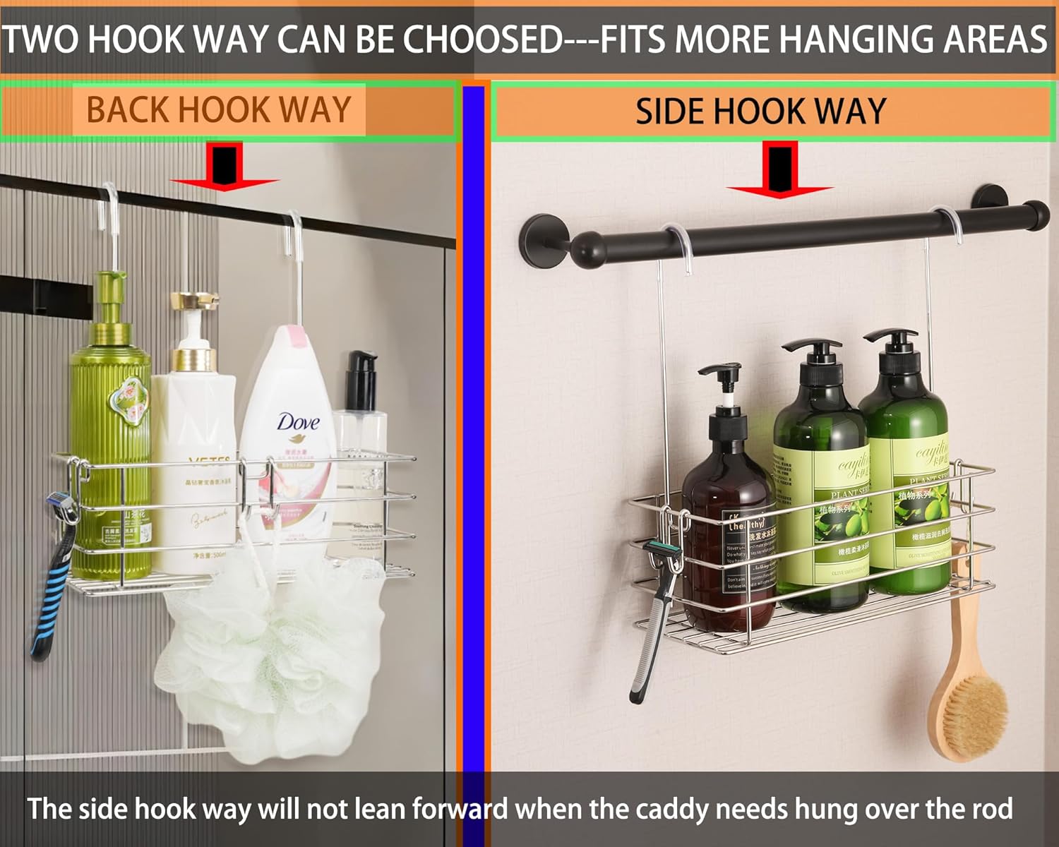 - Two HookWay Design: Compared to the original back hookway shower caddy, we specifically added a side hookway to keep it level. When it is necessary to hang over the shower bar/curtain rod/across rod/towel bar/grab bar that it will not lean forward