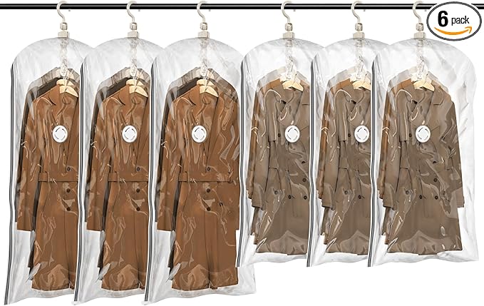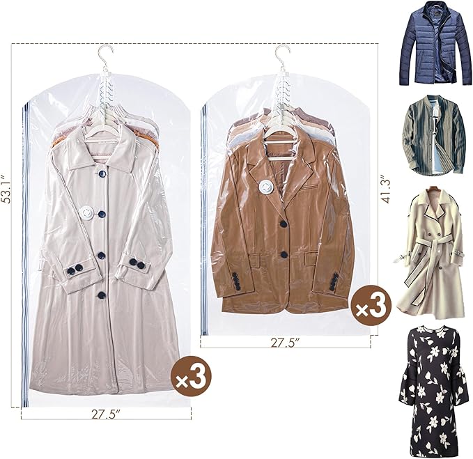 - Closet Storage and Organization: With our hanging vacuum bags(Size: 3 Long( 53.1x27.5 in)+ 3 Short( 41.3x27.5 in)), you can hang up to 5 pieces of clothing, including jackets, suits, and coats, in one bag and remove air from vacuum bags to reduce original space