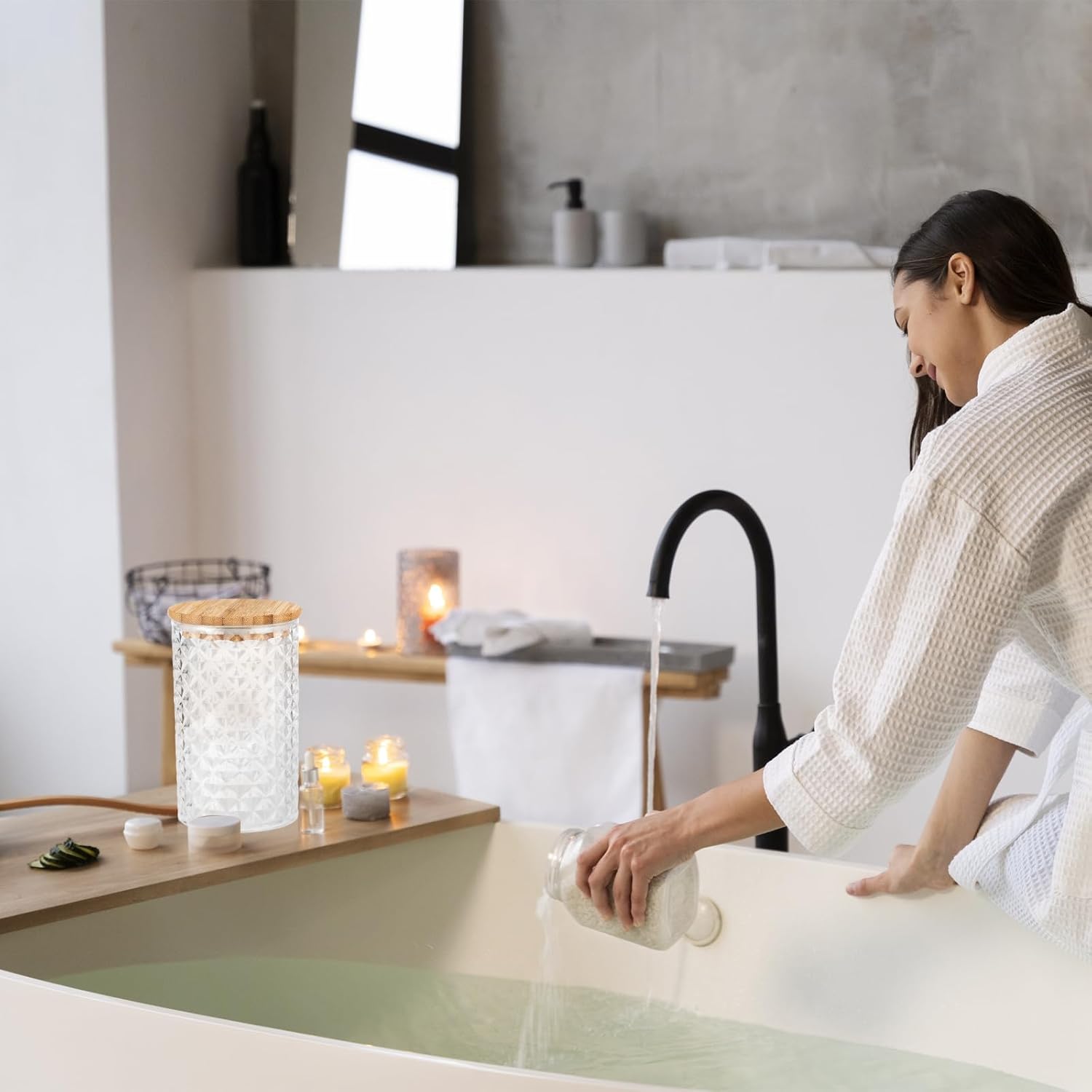 - Package Include:You will receive a piece Acrylic Bath Salt Jar with Wooden Scoop and lid.Bath salt Containers can be used to store cotton swabs, cotton balls, cotton pads, bath salts, etc.