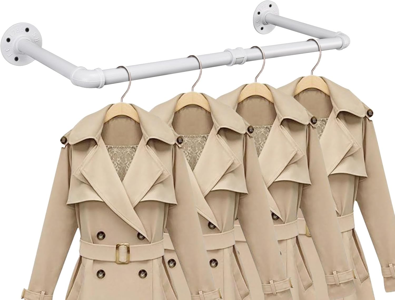 Industrial Iron Pipe Clothes Hanging Bar DIY Wall-Mounted Garment Rack Heavy Duty Clothing Rack for Bedroom, Laundry Room, Closet Storage (White 24 inch)