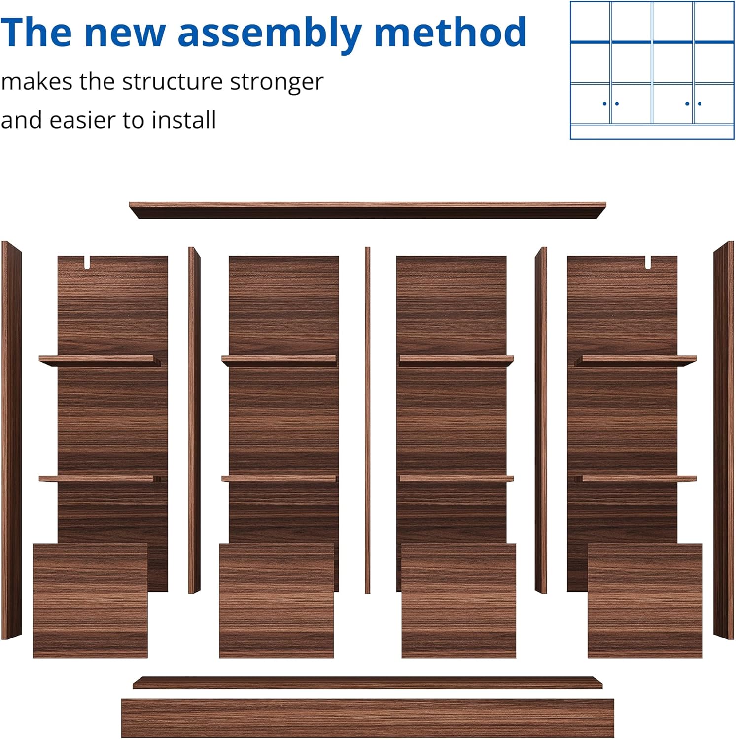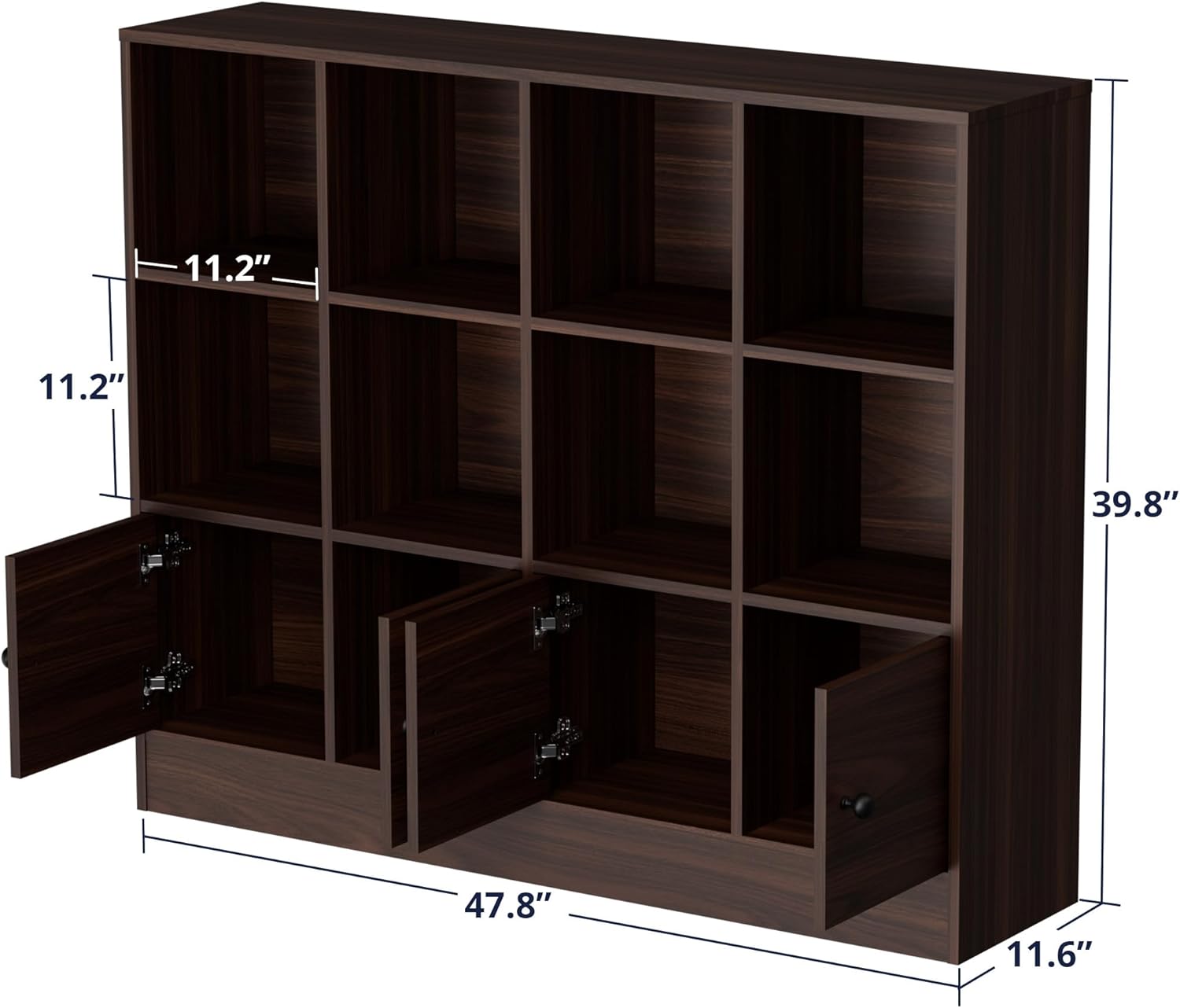 Cozy Castle Brown Wood Bookcase,12 Cube Storage Organizer Bookshelf with 4 Doors,3 Tier Storage Cabinet with Adjustable Shelves for Bedroom, Living Room, Office