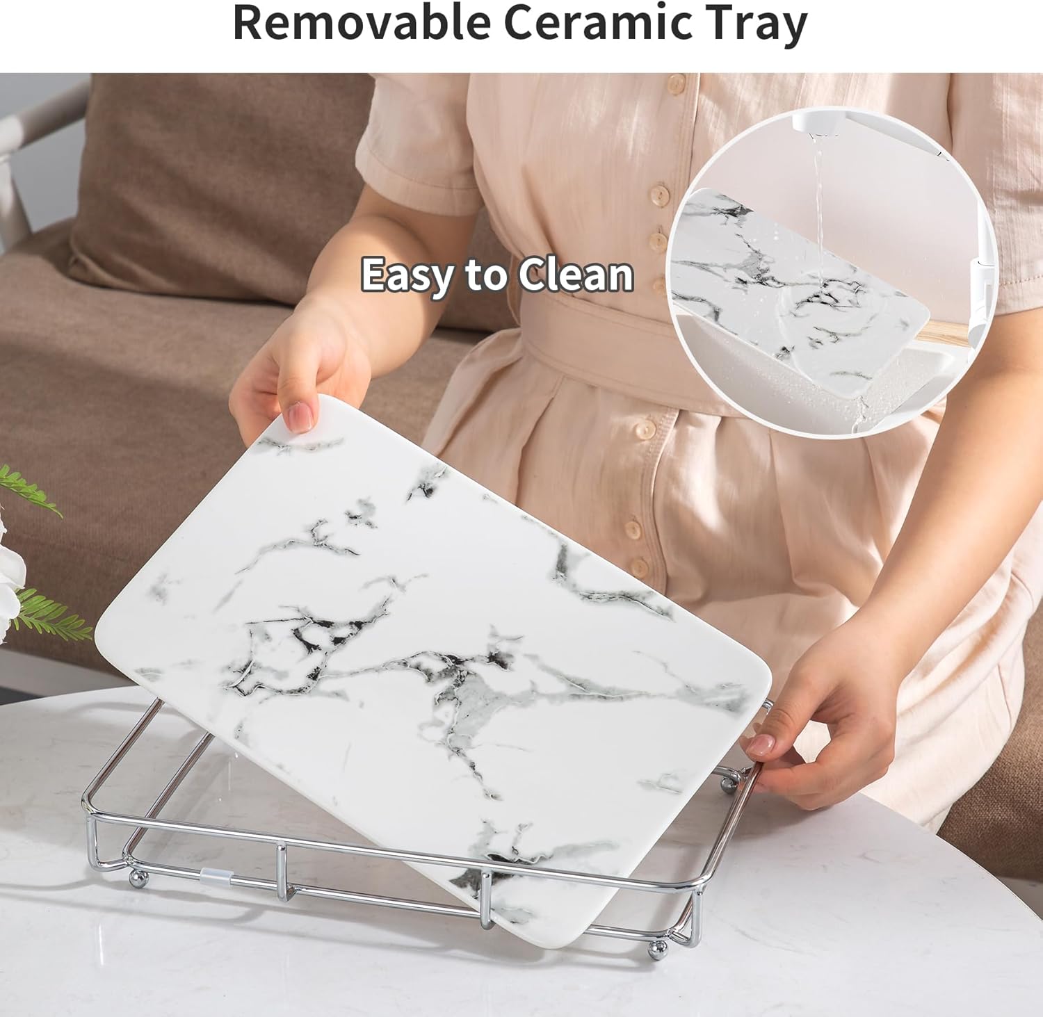 - High-Quality and Durable Organizer: The bathroom tray is made from high-quality stainless steel and a transformable white ceramic plate. It is not only easy to clean, but also versatile and can be placed anywhere you need.