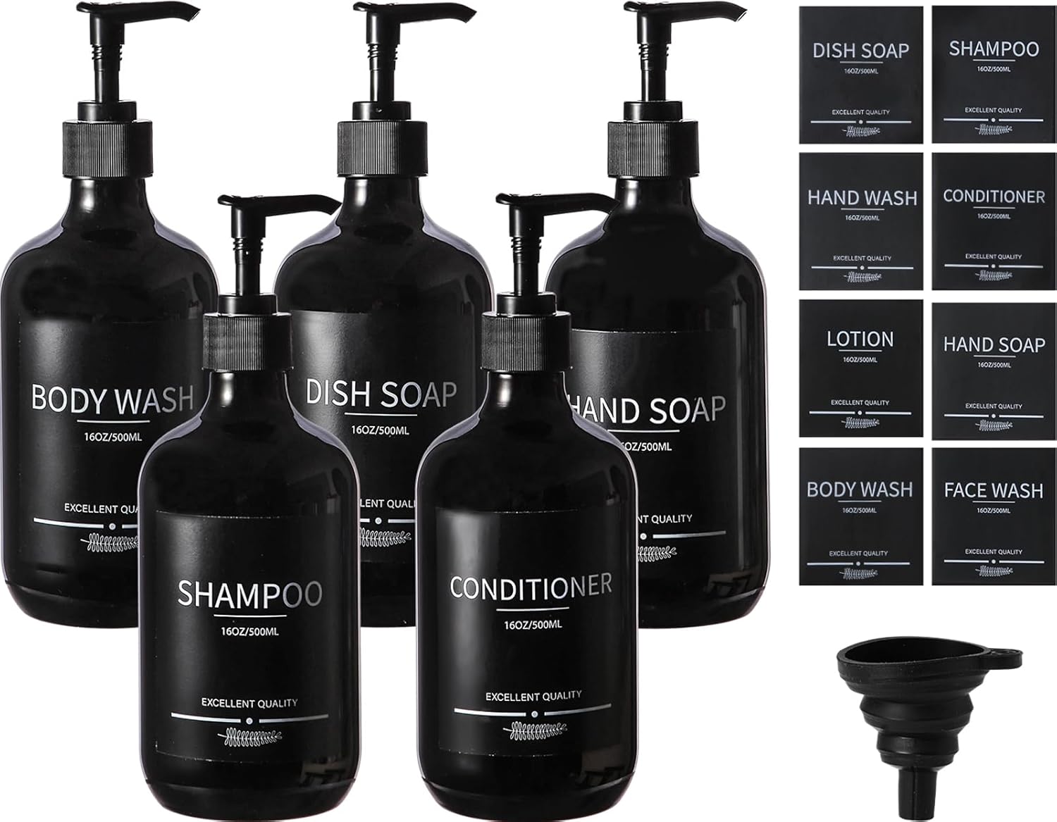 - 【Customize Your Set】Our shampoo and conditioner dispenser set includes 5pcs soap dispensers and 1pcs silicone funnel,the hand soap dispenser with 7.4 inches long and 2.9 inches in diameter, and can be filled with 16.9oz(500ml). in addition to this also includes 8pcs separate waterproof label stickers for SHAMPOO,CONDITIONER,BODY WASH,FACE WASH,HAND WASH,LOTION,HAND SOAP,DISH SOAP these labels are not pre-attached to the bottle, you are free to attach to the refillable shampoo bottls.