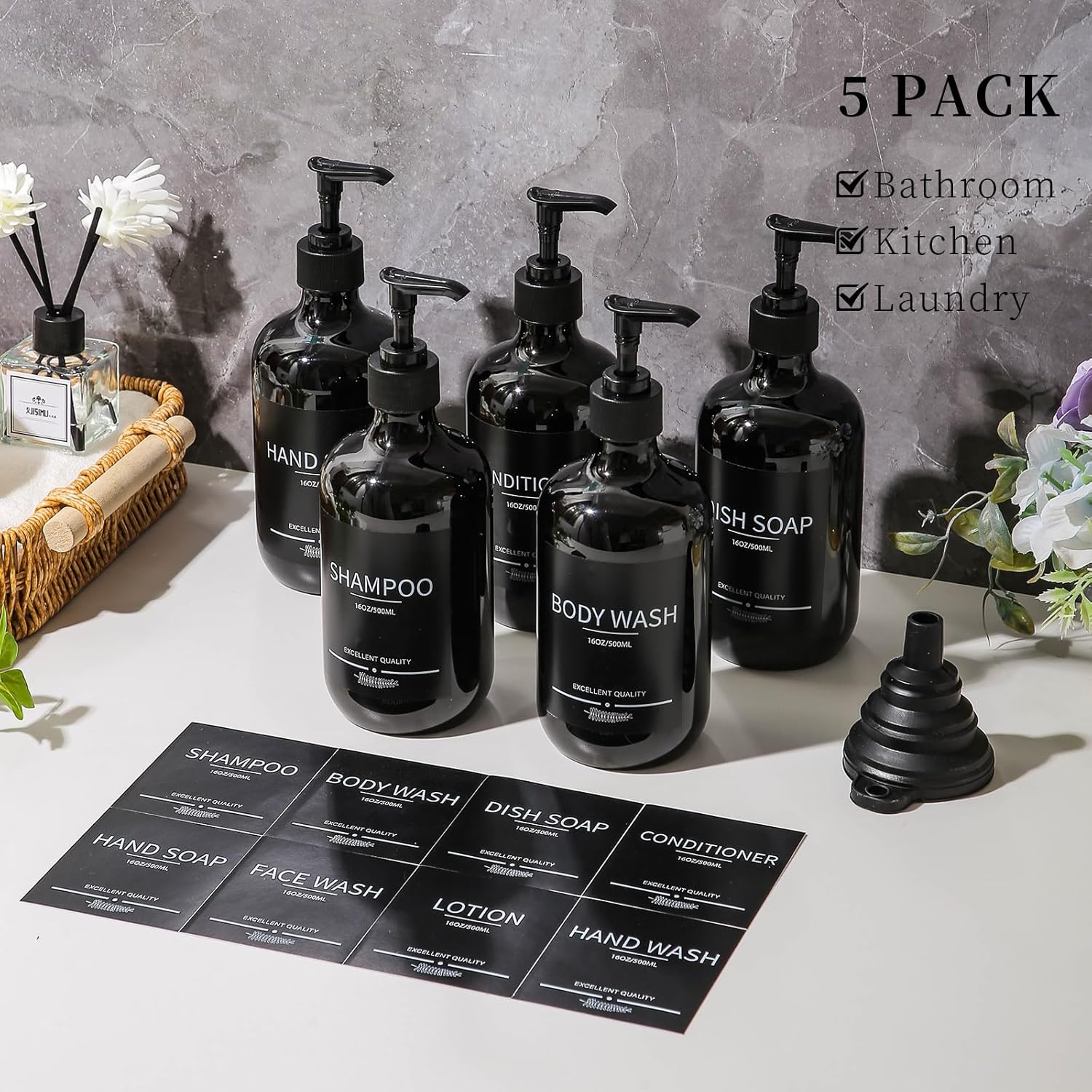 (5Pack) Black Shower Bottles Refillable with Labels, 16.9oz Reusable Shampoo and Conditioner Bottles,Shampoo Dispenser Bottles
