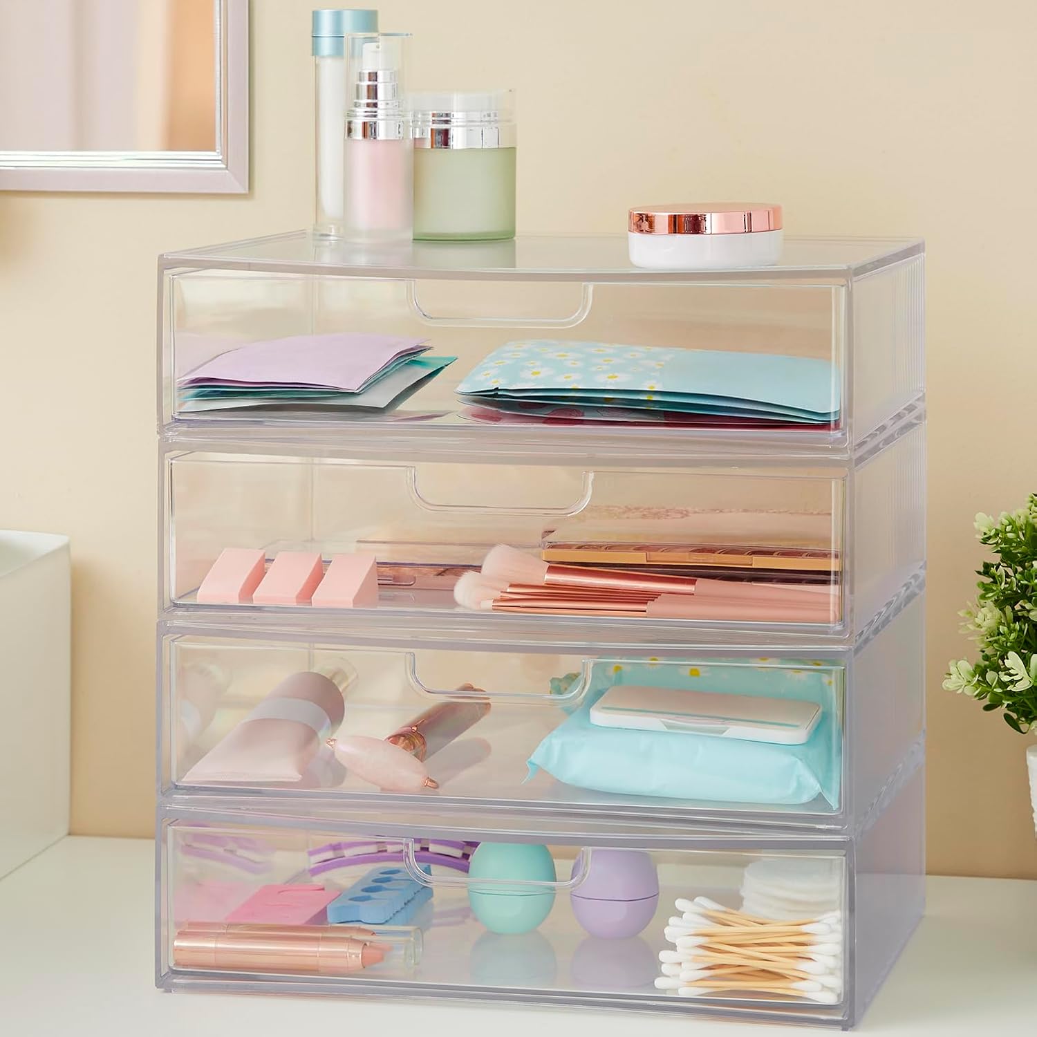 - The stackable design makes these containers compatible with cabinets found in bathrooms, kitchens, cabinets, closets, and offices. They make a great space saving option for cosmetics, makeup, jewelry, kitchens utensils, cleaning tools, and office supplies. Rectangular outer shells with open drawers keep workspace supplies tidy.