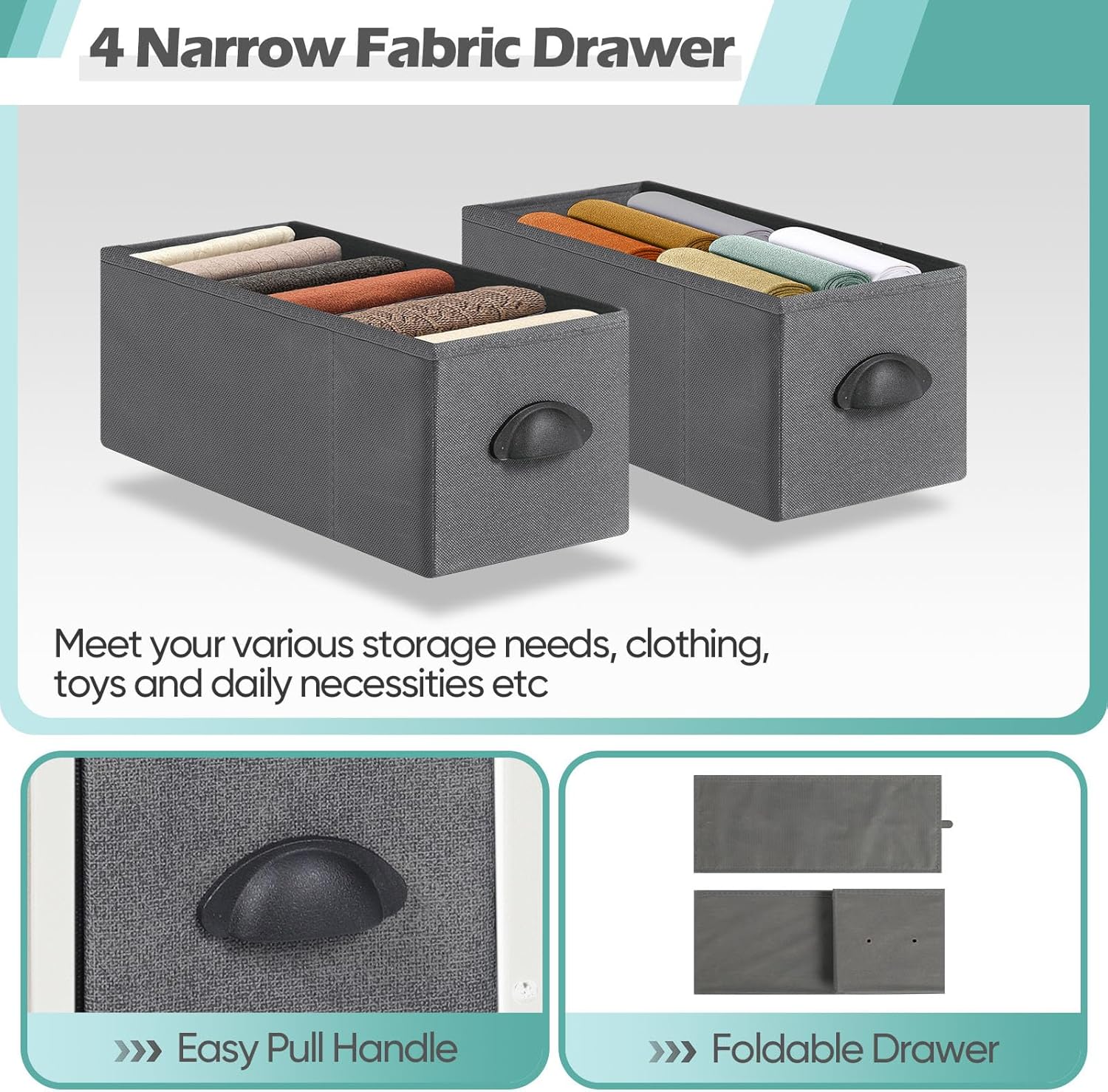 - MULTIFUNCTION DRESSER: The chest of drawers contains 4 removable and foldable drawers, providing multiple storage options and plenty of space. You will need such a narrow dresser or bedside table to store clothes, scarves, socks, toiletries, makeup tools, cosmetics, office supplies, toys and more.