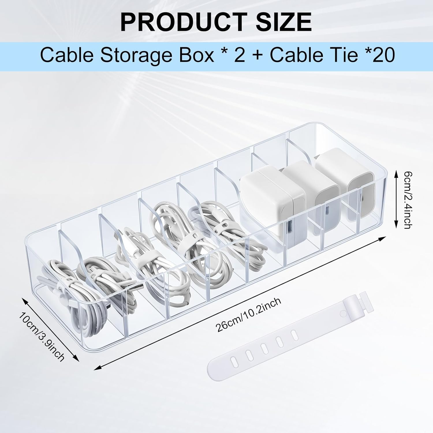 - Nice Combination: you will receive 2 pcs charger organizer boxes (10.2 x 3.9 x 2.4 inches/ 26 x 10 x 6 cm) and 20 pcs silicone wire ties; Our cable management box kit is convenient and easy to clean and store small desk accessories, thus saving space and keeping desk tidy