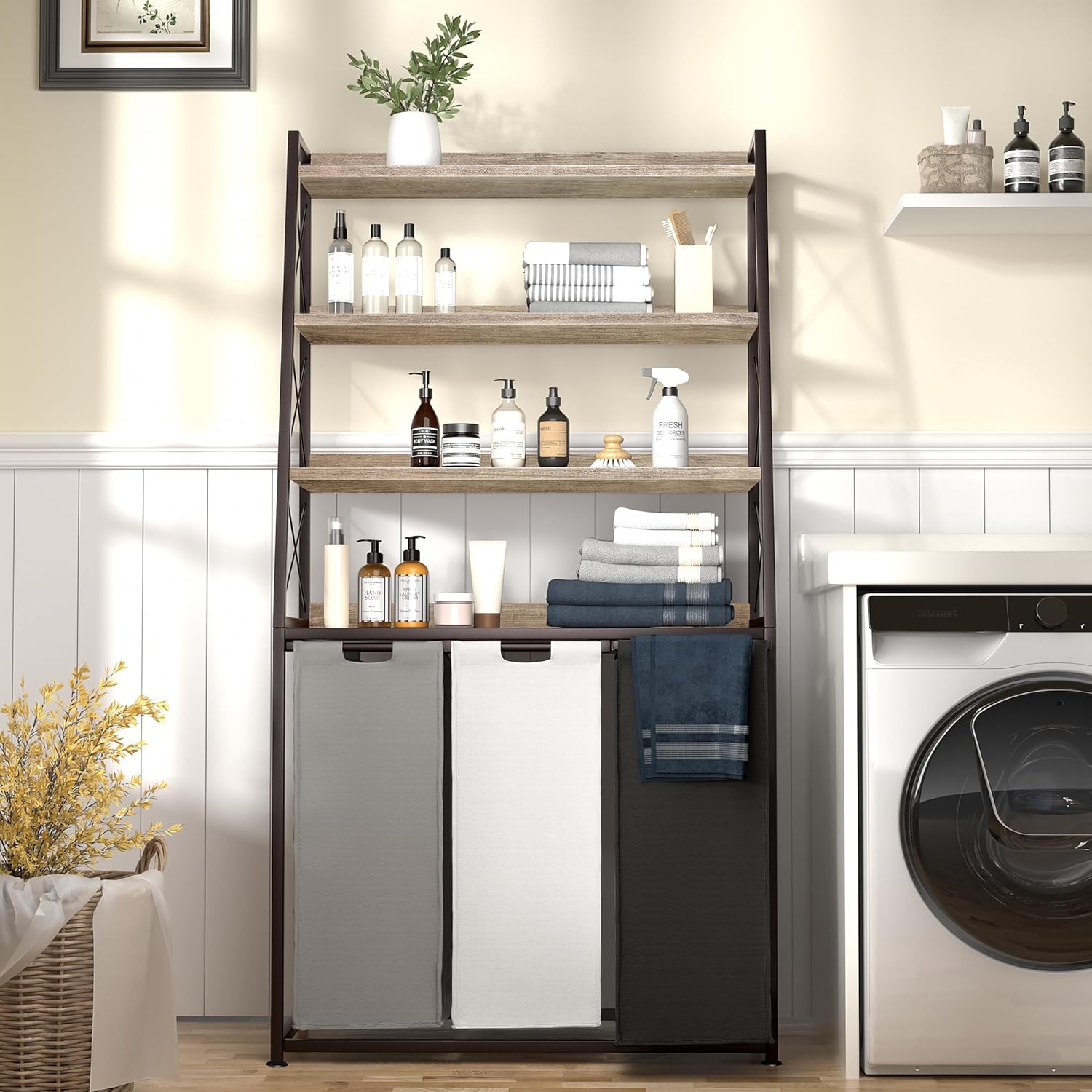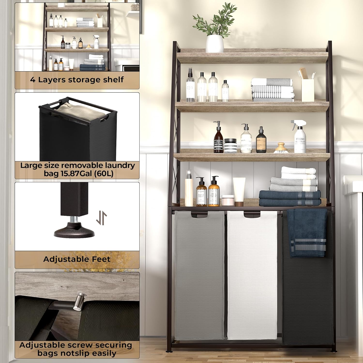 Laundry Basket, 3 Section Laundry Hamper with 4 Tiers Shelf, Pull-Out and Removable Laundry Bags, Large 3 x 15.87 Gallons, for Laundry Room Bathroom Greige PF05XLZ